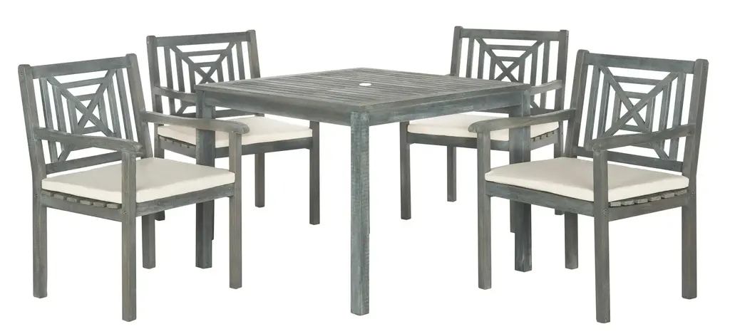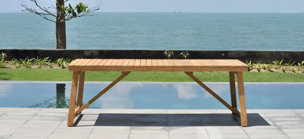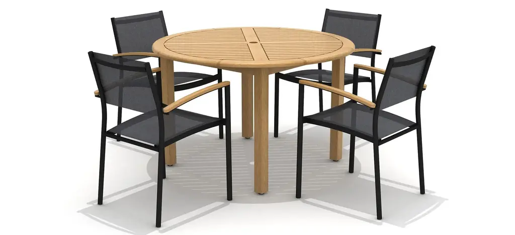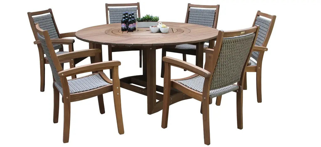 Lifestyle Garden Outdoor 9-pc. rectangular dining set made of high quality certified teak wood exclusively grown in Indonesia. Teak is a natural living material that is renowned for its rich golden-brown color, but also for its classic aging appearance after exposure to the elements of weather and time. It is also well known for its ability to withstand prolonged weathering and heavy impacts in the outdoor living environment. Main properties of teak include its sustainability, natural durability, classic finish, and rich earthy tones.