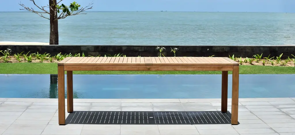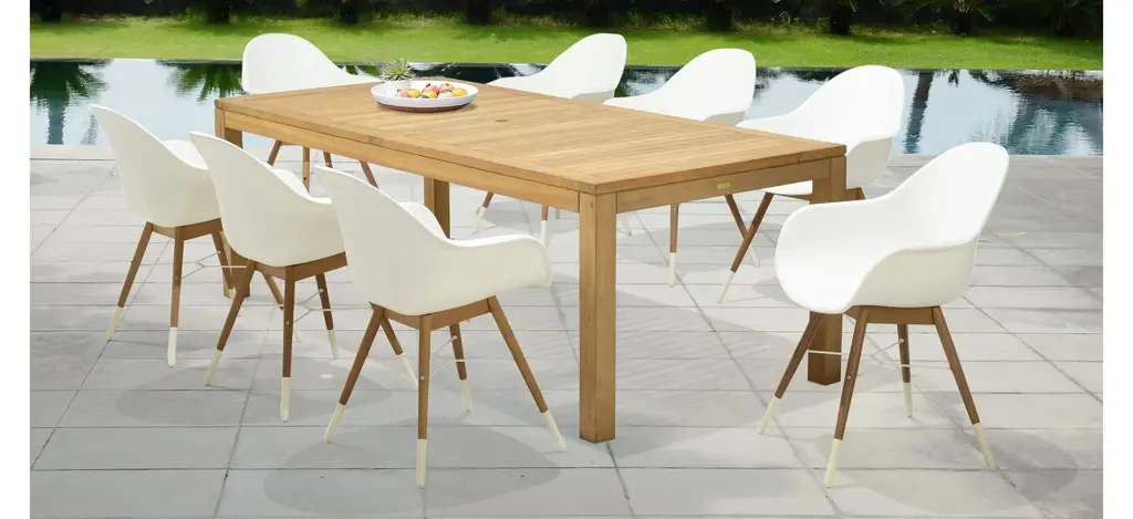 Lifestyle Garden Outdoor 9-pc. rectangular dining set made of high quality certified teak wood exclusively grown in Indonesia. Teak is a natural living material that is renowned for its rich golden-brown color, but also for its classic aging appearance after exposure to the elements of weather and time. It is also well known for its ability to withstand prolonged weathering and heavy impacts in the outdoor living environment. Main properties of teak include its sustainability, natural durability, classic finish, and rich earthy tones.