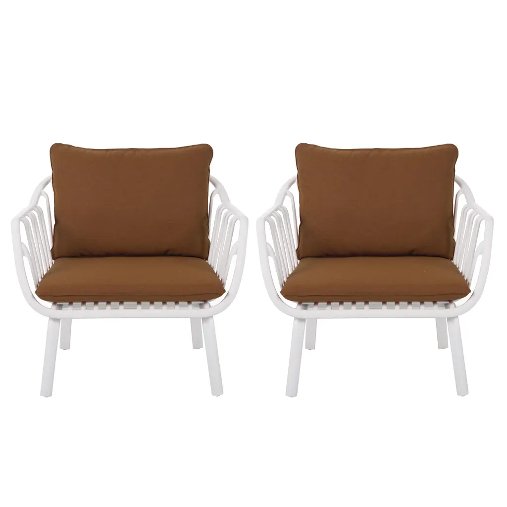 Enhance your outdoor space with this set of two club chairs, combining style and durability. The curvaceous frame and open slat accents create a sleek, modern look while offering breathable comfort. Crafted from high-quality polypropylene, these chairs are built to withstand the elements and maintain their appearance over time. Complete with plush back and seat cushions, this weather-resistant set provides a cozy retreat for any outdoor setting.