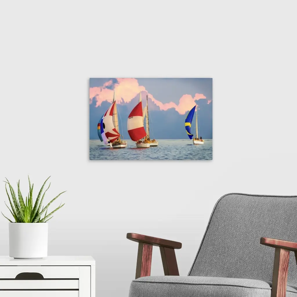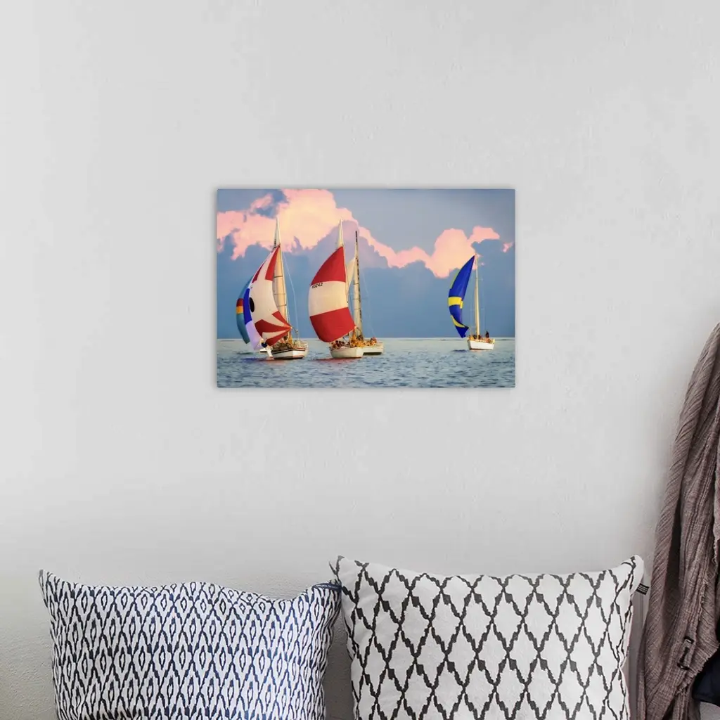 Sailboats with colorful sails on the water with large clouds in the sky.