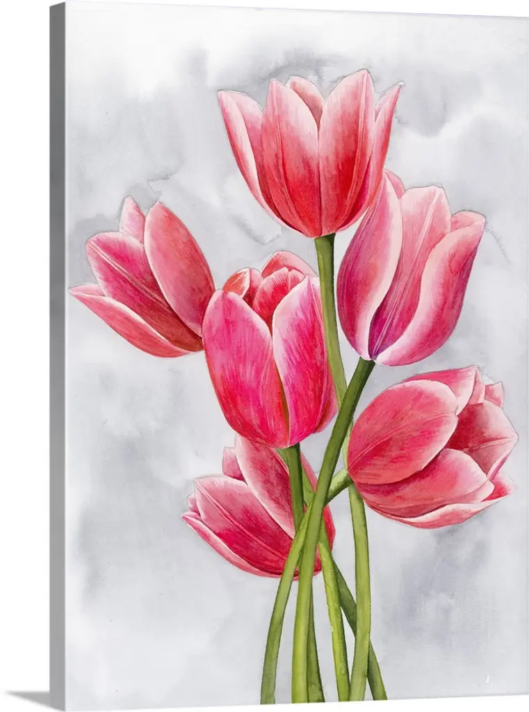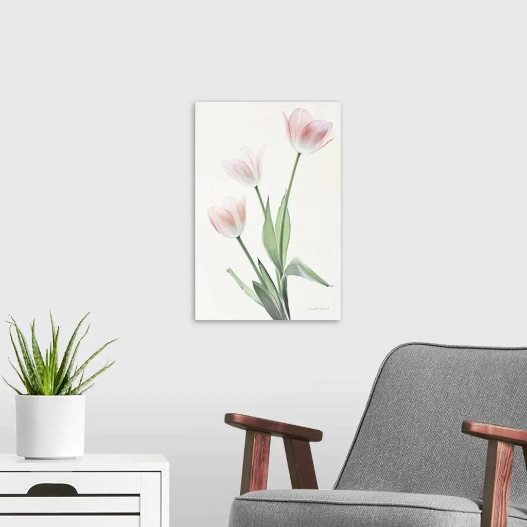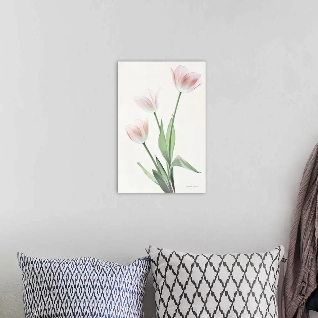 Photograph of pink tulips in muted tones that fade into the white background.