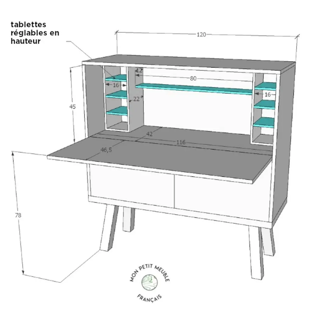 This large secretary desk is designed by the famous parisian Designer Eric Gizard and delivered fully mounted. The overall dimensions of the box itself areWidth 120 cm / 47.2''Height 90 cm / 35.4'' Depth 46 cm / 18.11''Height of the feet is 35 cm / 13.8''Useful height behind the lower hinged doors is 37 cm / 14.6''Overall width of each compartment behind the hinged doors is 57 cm / 22.4'' and useful width is 38 cm / 15.0'' due to the hinges. The vertical interior divider behind the lower doors is automatically placed in the middle of the width but can be moved during the manufacture processi if required at the order.The upper working part is fitted with a flap-down door with a "push-loose" opening. You will be able to work with your laptops and smarphones and pad on it. The 2 lower doors open also with a "push-to-release" pressure in the middle. The 2 shelves behind these doors are on cleats and removable. Cable passages are made for each level at the rear of the secretary desk. The color of the interior elements is identical to the colour of the flap-down door.Égée CollectionThis secretary desk belongs to the ÉGÉE designed by the famous Parisian designer Eric Gizard. Eric adopts for this piece the refined codes of Scandinavian design, combining natural materials, elegance and sobriety of lines and adding very beautiful muted and "trendy" colors.Mon Petit Meuble Françaisoffers you exclusively 100% French products. The solid wood comes exclusively from sustainably managed French forests.The manufacture and finishes are of very high-end quality, carried out in French workshops in Mayenne, France.
