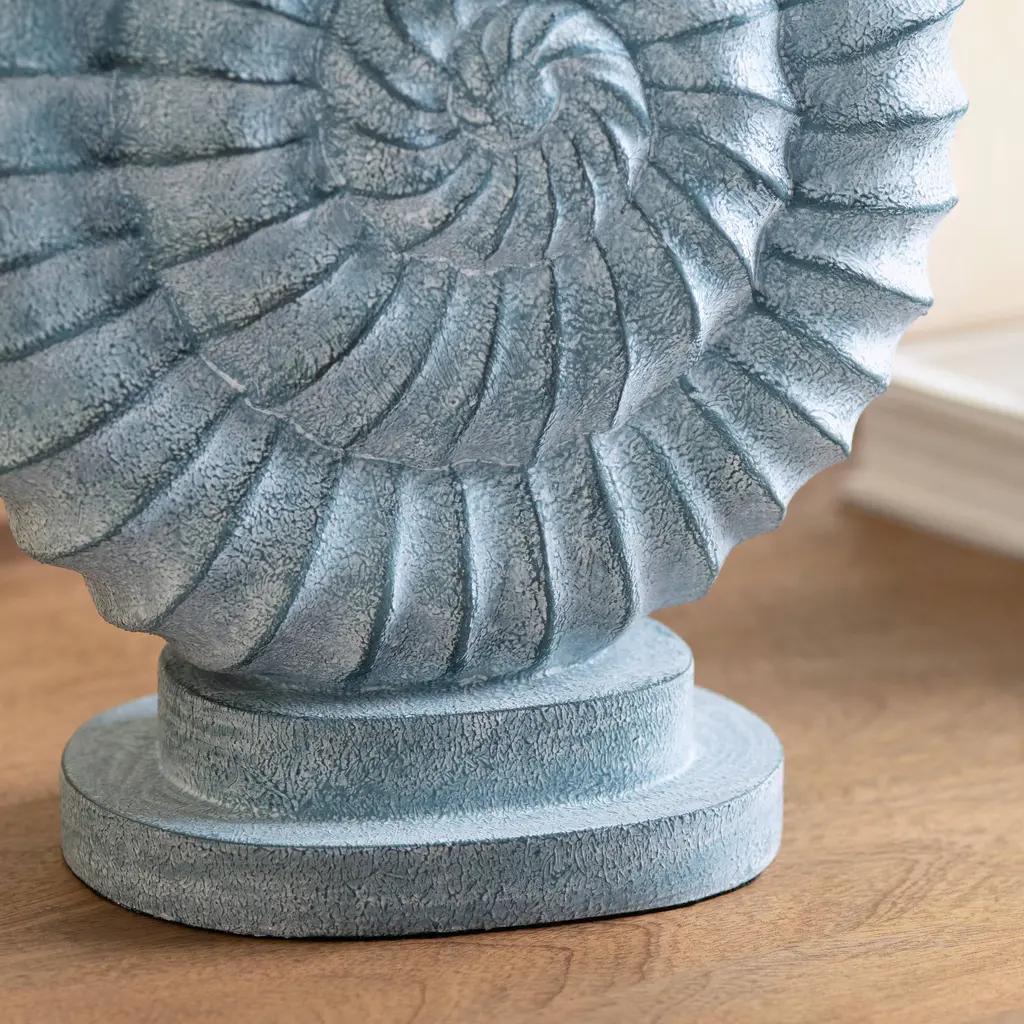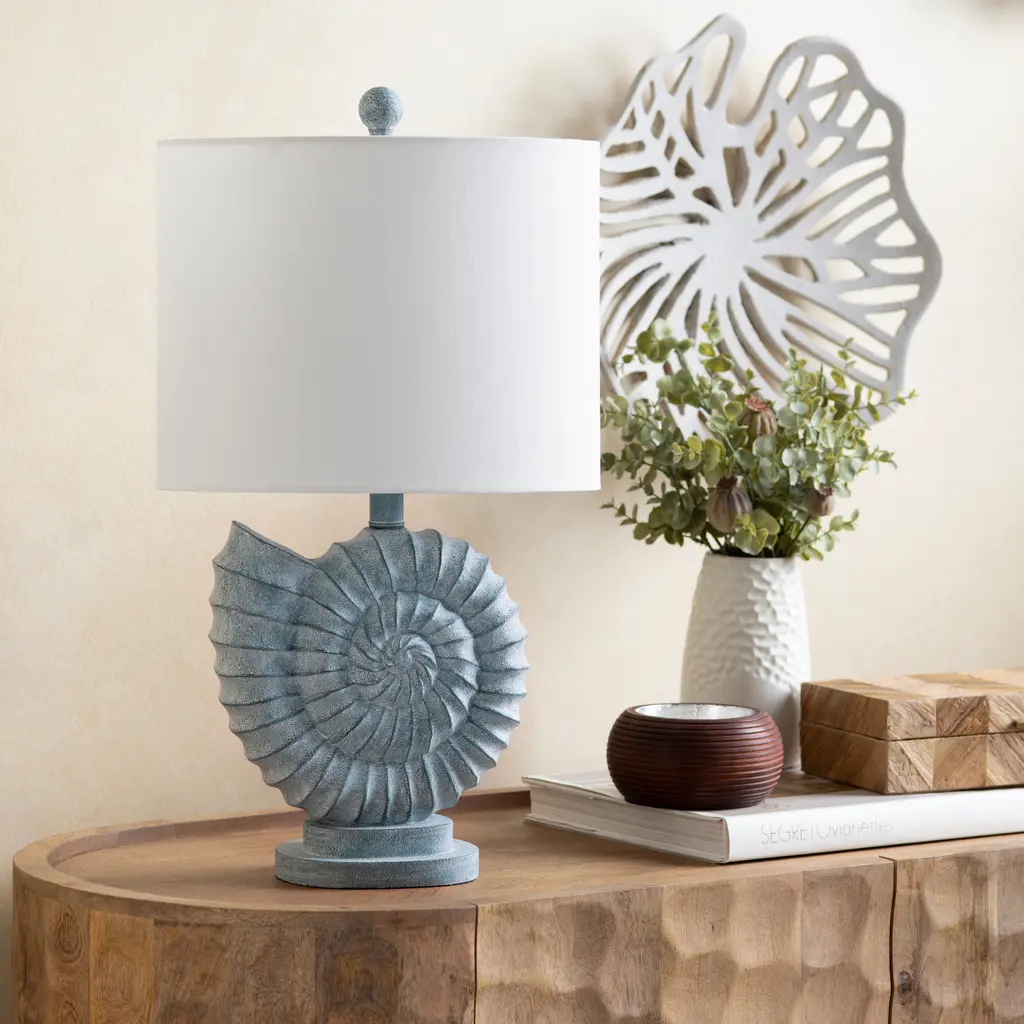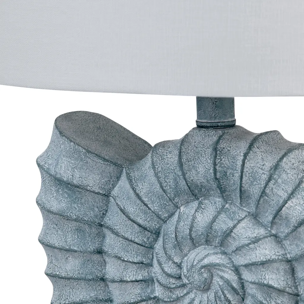 Bring a touch of coastal charm to your space with this beautifully sculpted table lamp, featuring a spiral ammonite shell-inspired body crafted from resin in a textured blue finish. The intricate ridges and weathered details give it an authentic ocean-inspired look. Topped with a hardback oval linen shade in crisp white, it diffuses light softly for a warm ambiance. Designed for convenience, this lamp includes a rotary on/off switch, a 72-inch clear plastic cord, and accommodates a 100W bulb (not included)
