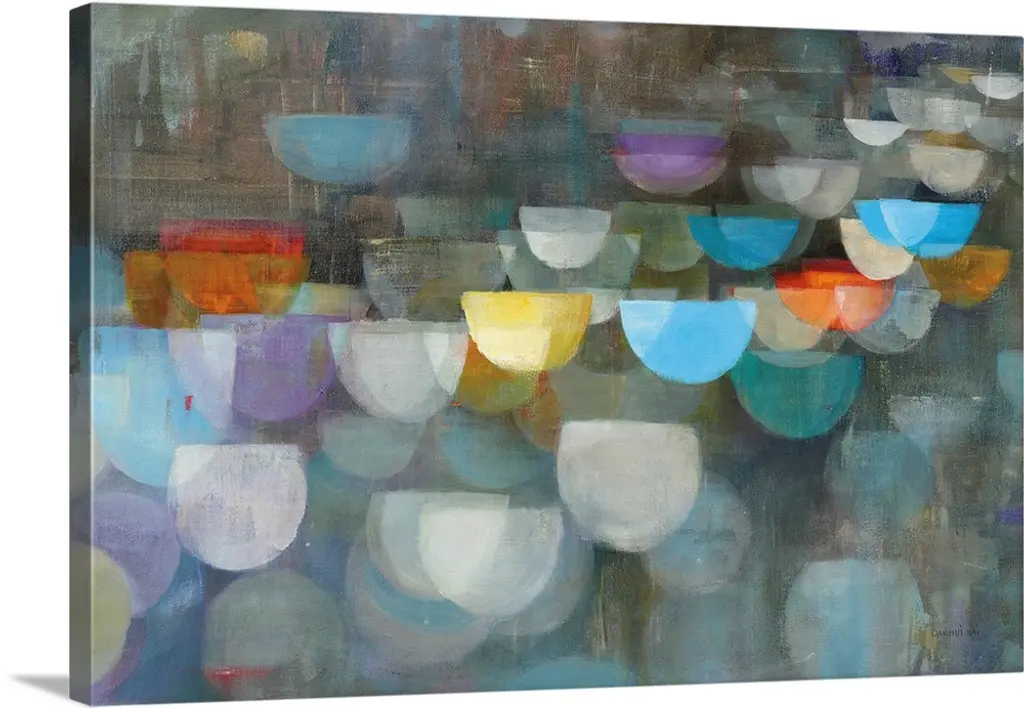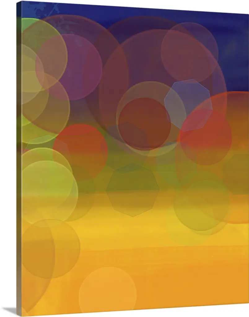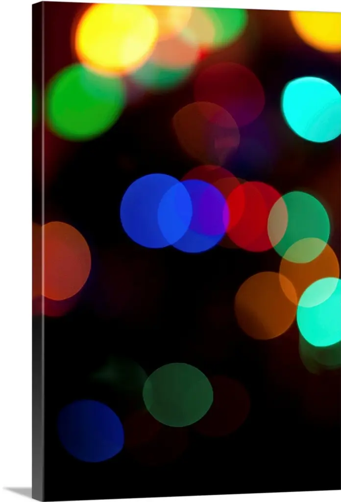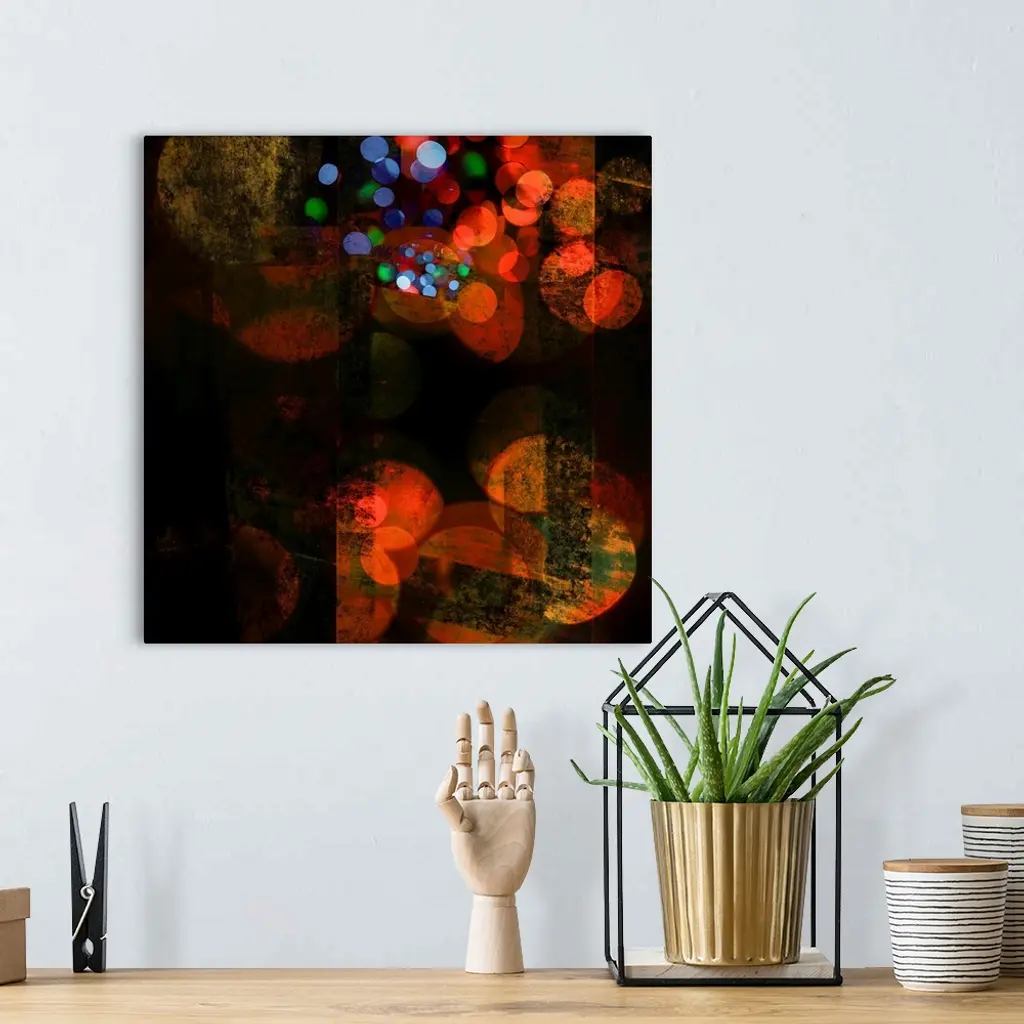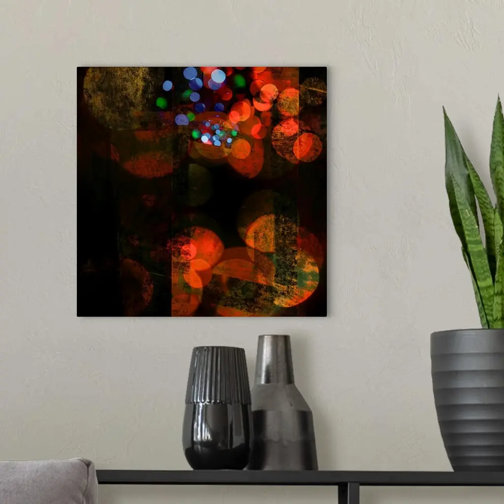 Abstract photograph of blurred circles in bright colors of orange, red and blue.