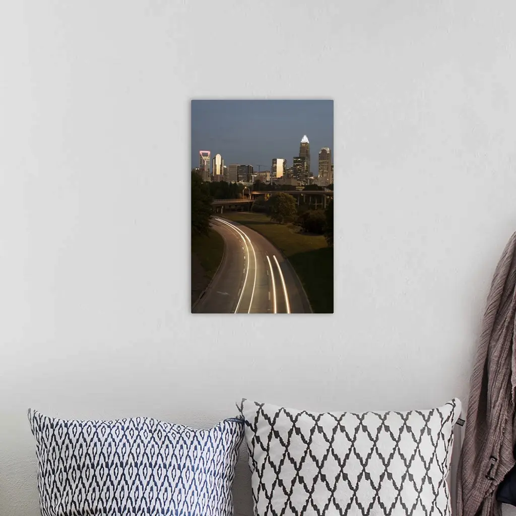 Light trails fill the foreground with Charlotte skyline in the background.