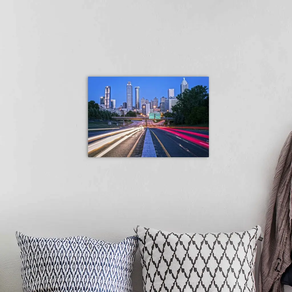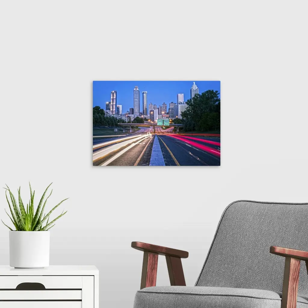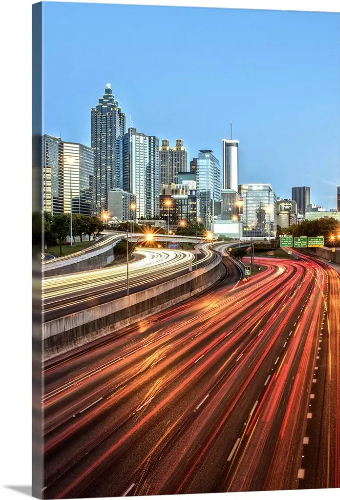 Bright light trails from traffic on the freeway, headed towards the Atlanta, Georgia skyline at twilight.