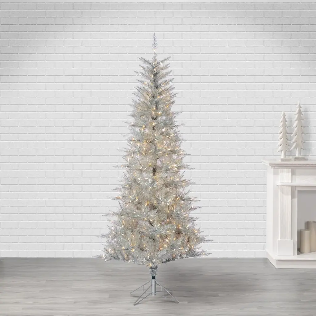 Effortless holiday cheer. This artificial Christmas tree shines brilliantly with stay-lit 450 warm white lights. It includes 822 branch tips for a lush look, but is slender enough to tuck into tight corners and entryways. Extra bulbs and metal stand included for a hassle-free festive season.