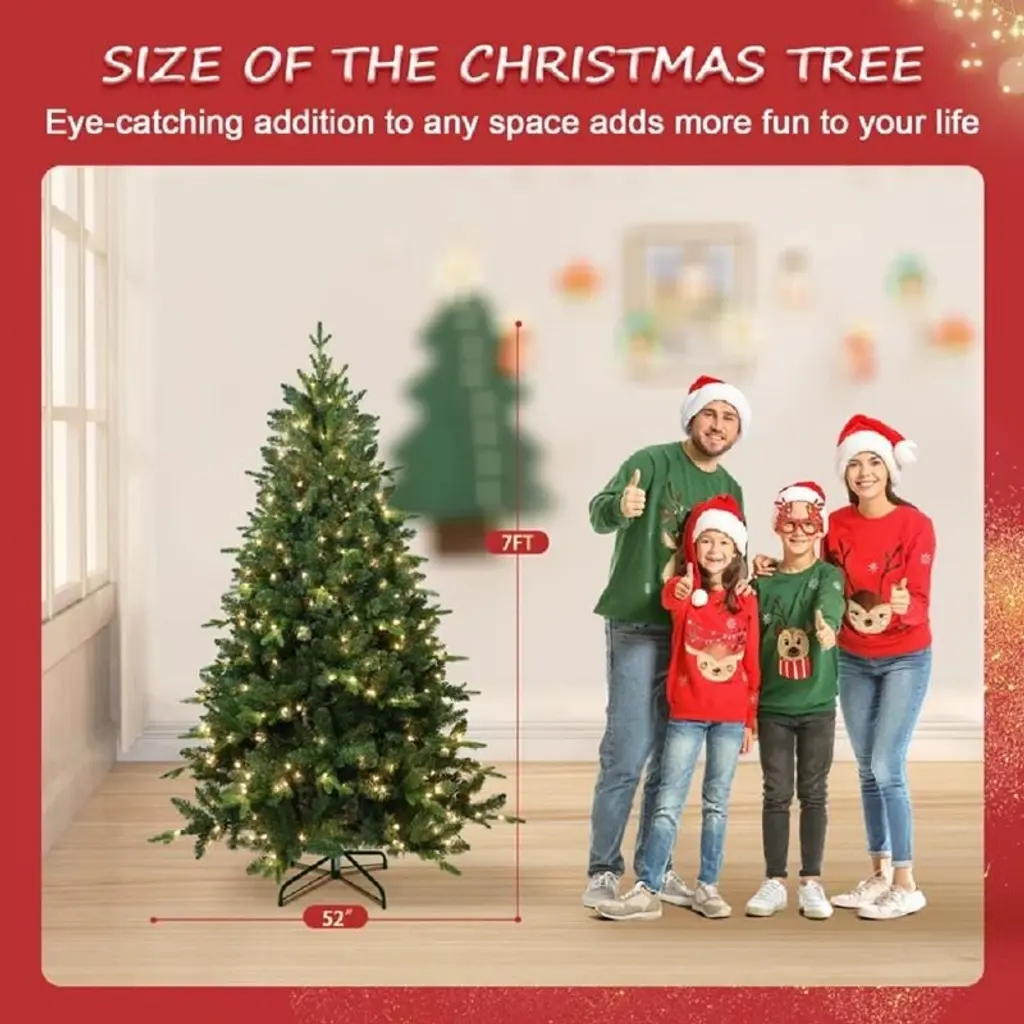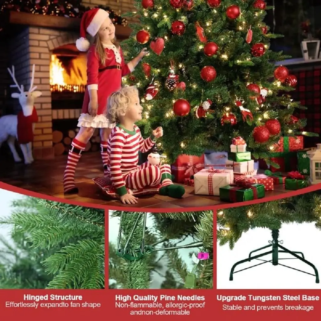 Bring a festive spirit to your home this holiday season with this classic Christmas tree. A nice Christmas tree is perfect for the holidays. Thousands of branches provide plenty of room to hang Christmas decorations and ornaments. The classic Christmas elements make it a great decoration for Christmas and the holiday season. Enjoy your decorating time and the joy of finishing with our artificial Christmas tree to add ambiance to your life and fill your home with the holiday spirit.Features:CONVENIENT HINGED DESIGN: Our hinged artificial Christmas tree is the ideal Christmas tree to bring out the holiday spirit. This artificial Christmas tree gives a rustic, realistic feel and look for those who are looking for a distinctive Christmas tree. Includes metal stand.REALISTIC FULL: Our 4/5/6/6.5/7/7.5 foot Christmas tree has 150/300/350/400/450/500 warm colored lights that are unmatched by any other Christmas tree, bring home the most realistic, full Christmas tree for the holidays.WARM LIGHTS: This tree comes pre-installed with UL tungsten lights to make tree installation a breeze. These lights give off a warm glow that highlights your decorations and holiday gifts, making your Christmas tree look extra special.REUSABLE: Although the holiday season is only a few short months away, this Christmas tree will last much longer. Made from high quality new polyethylene (PE), polyvinyl chloride (PVC) and sturdy metal supports, you can rest assured that your Christmas tree will be stored for a long time without any problems. These materials are also flame retardant and non-allergenic.EASY TO ASSEMBLE: Our Christmas trees feature hinged branches that are easy to assemble and disassemble. The branches easily drape into place for fluffing and folding for storage. You can adjust the branches for a more elegant look.