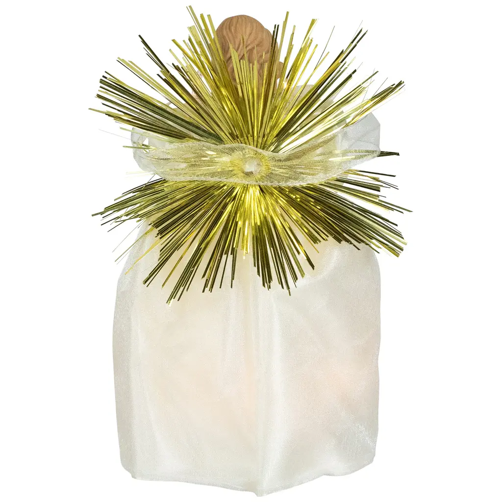 This stunning angel is dressed in a luxurious burgundy gown adorned with gold details. Her wings, dress, and flower feature continuously changing multi-color fiber optics, creating a mesmerizing display. Easy to attach with a reinforced clear plastic cone, this angel can also be used as a charming tabletop decoration. Complete with an adaptor, this enchanting tree topper will bring a heavenly glow to your holiday decor. Product Features: Color: multicolor fiber-optic / black wire 6' lead cord One-sided design Dressed in a burgundy gown adorned with gold glitter, beads and sequins Color-changing fiber optic wings, dress and flower Additional Product Features: UL certified and approved for indoor use only Continuously changing multi-color fiber optics Comes with a reinforced clear plastic cone to attach to the tree Class 2 power supply adapter included Input: 100-240V, 50/60Hz, 0.2A Output: 4.5V, 0.2A Dimensions: 12" high x 5" diameter Material(s): plastic/fabric/wire