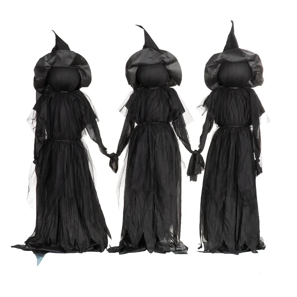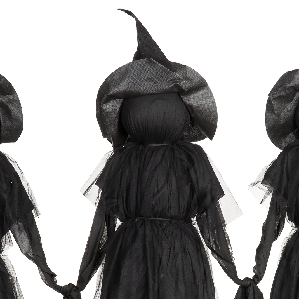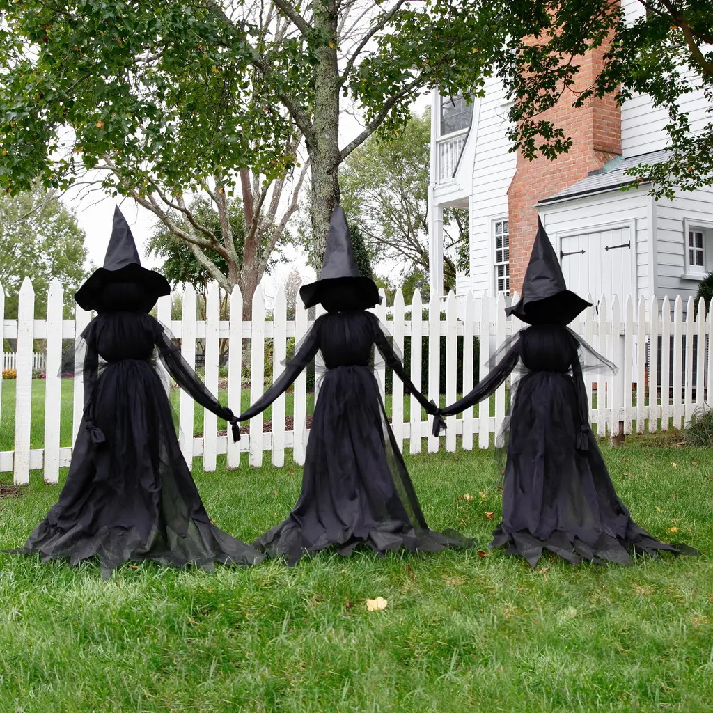Something wicked this way comes.....A frightful sight day or night, our Lighted Halloween Witch Stakes are dressed all in black with faceless heads that glow and flicker in a ghastly display. This triplet of witches hold hands in an eerie exhibit of sinister sisterhood. You'll love the specter they create in your front yard - and their included ground stakes make them so easy to display. Lightweight and sturdy plastic frames with flowing black polyester fabric. Battery-operated; each witch uses 3x AA batteries, not included. Imported.