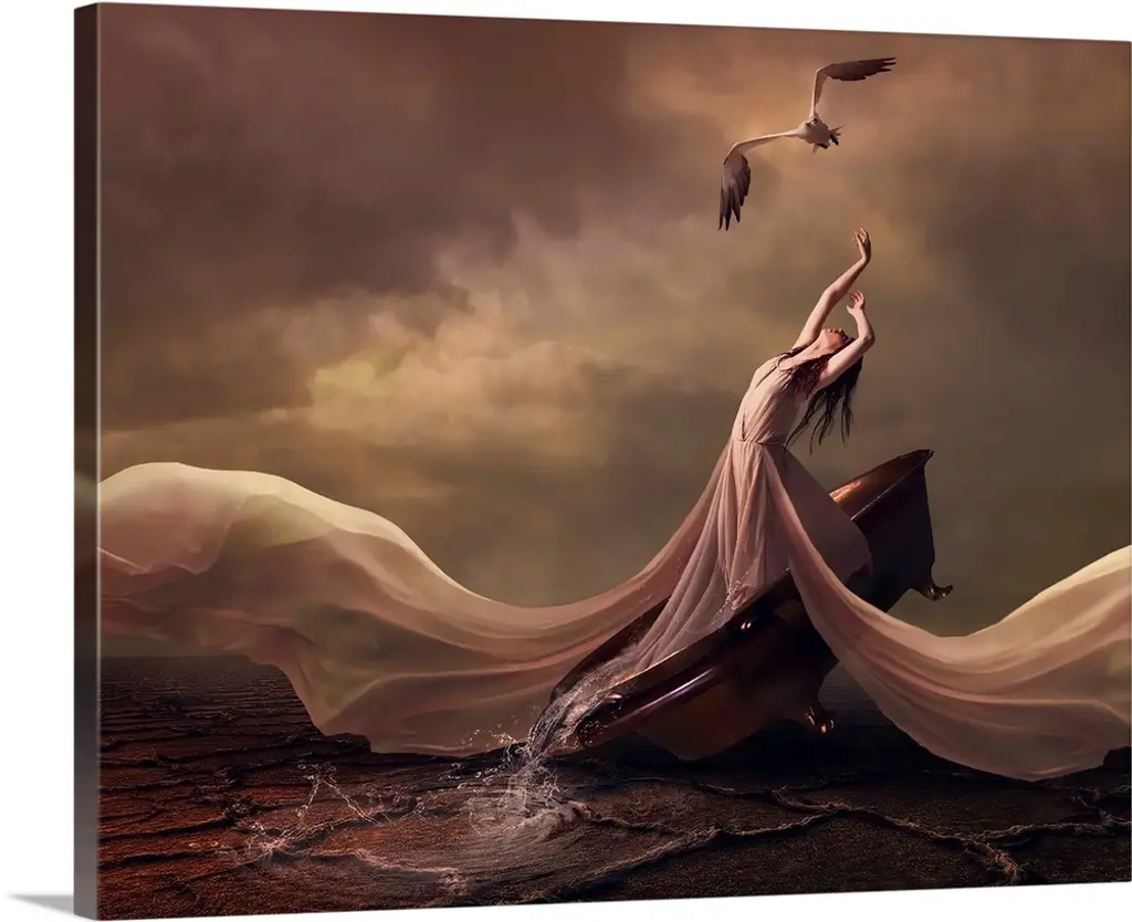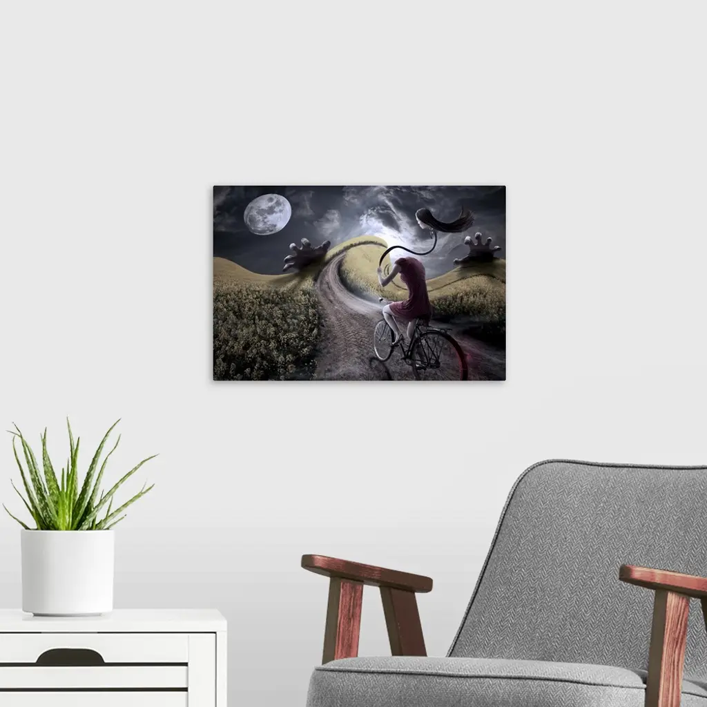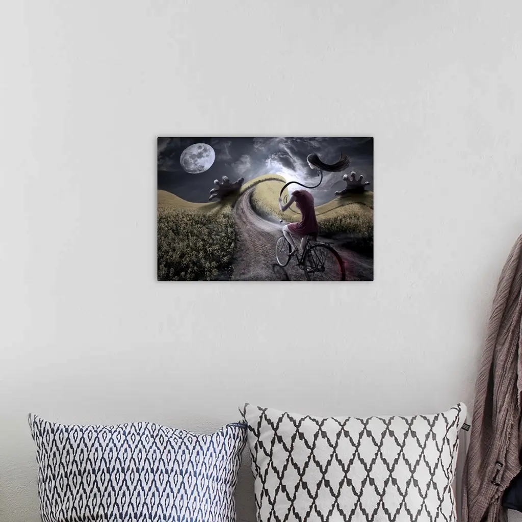 Conceptual image of a woman on a bicycle in a dreamscape.