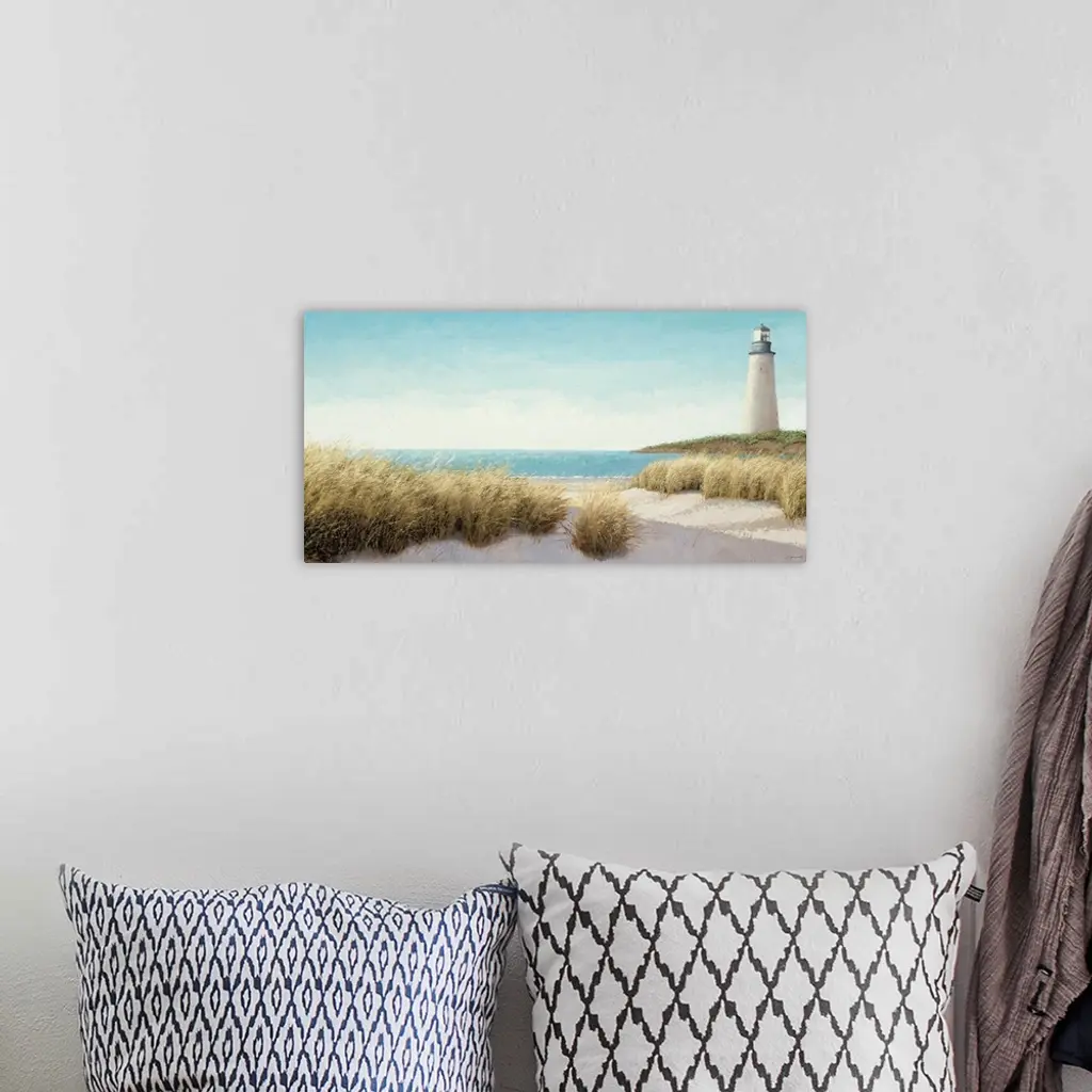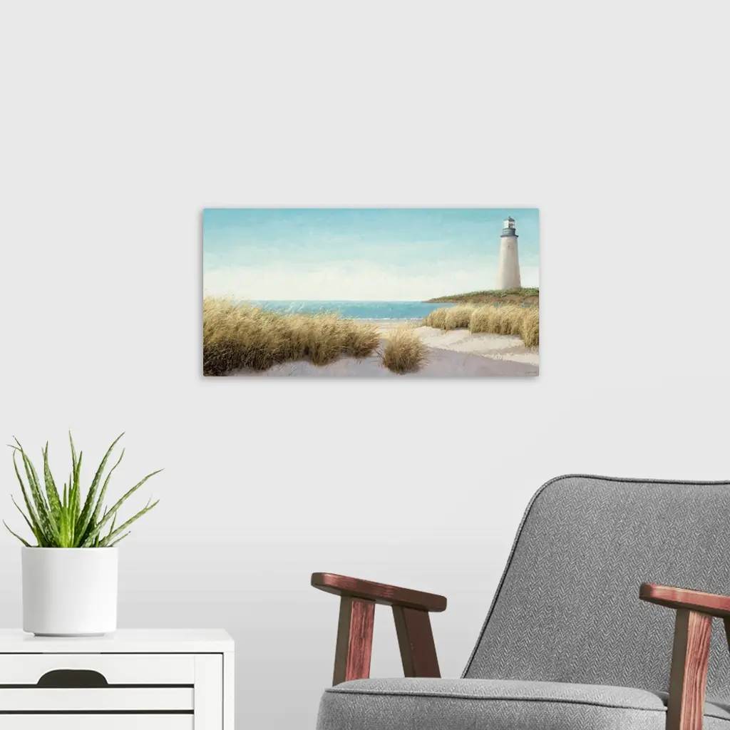 Horizontal, large wall picture of grasses blowing on the beach. A lighthouse in the distance, next to blue waters.