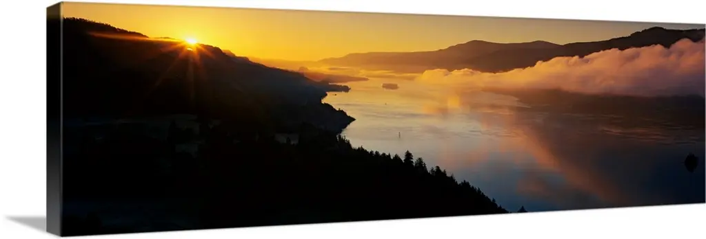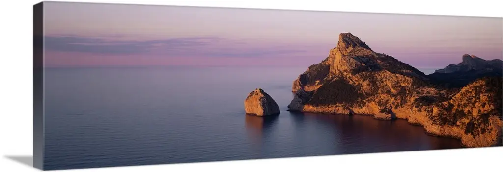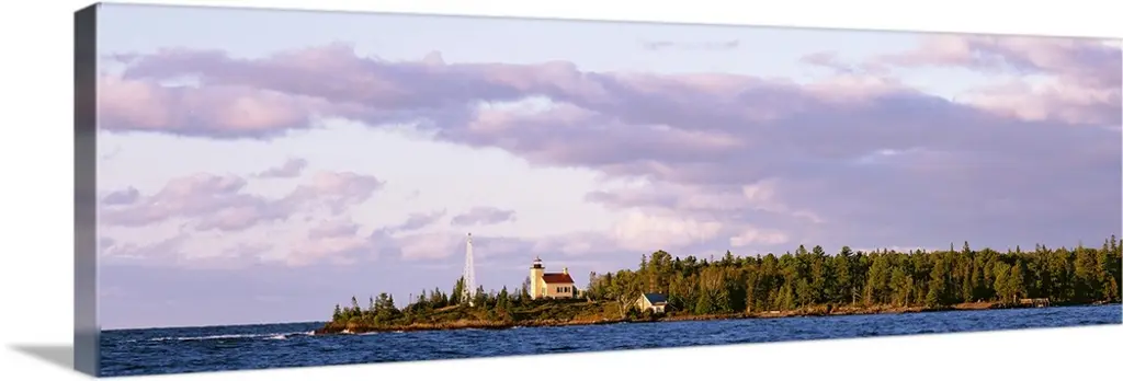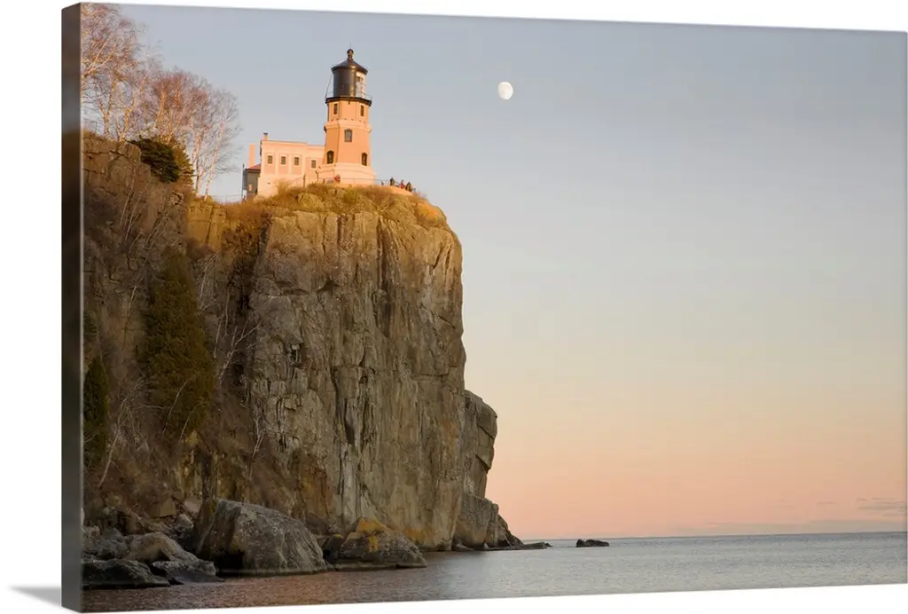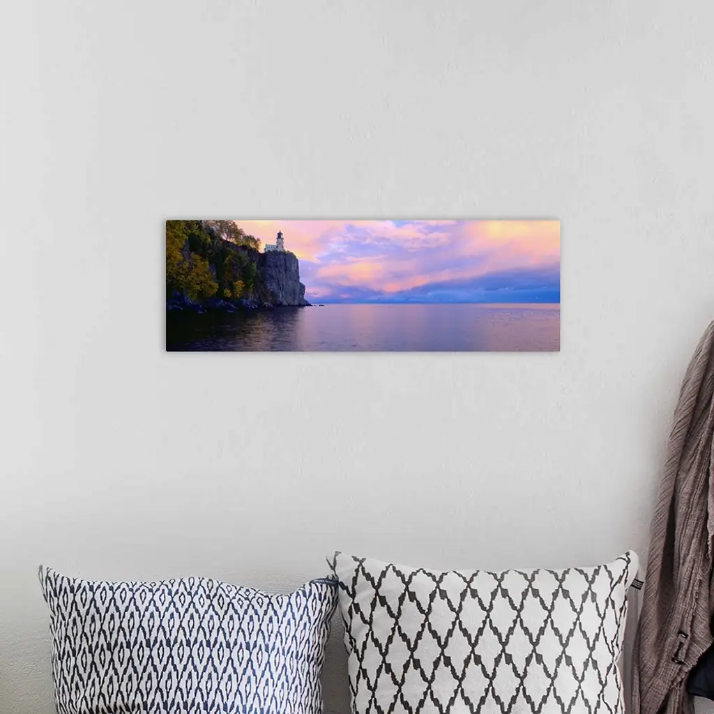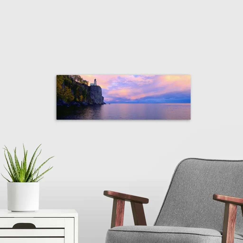 Panoramic photo print of a lighthouse on top of a cliff overlooking the water at sunset.