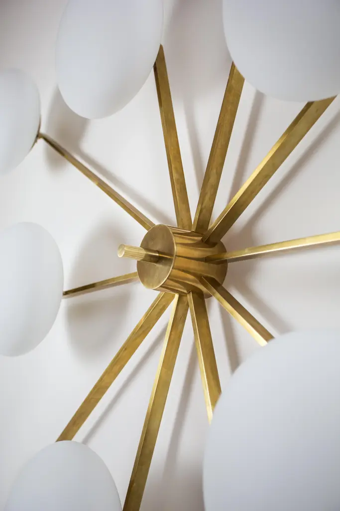 The Stella Cosmos Wall / Ceiling Light brings elegance to midcentury design through the inspiration of Italian design - inspired by Angelo Lelli. A handmade Brass body is arranged in an innovative pattern to display a collection of opaque glass diffusers. Once illuminated, the Stella Cosmos shines with luster and instantly adds sophisticated ambiance to your space. BRASS FINISH Available with different brass finishes : Blackened, Bronze, Chromed Lucid, Chromed Opaque, Polished, Polished Brushed, Unpolished Balanced, Unpolished Lucid, and Unpolished Opaque finish. I will be in touch with you post purchase to determine the exact brass finish you want - We are offering 9 brass finishes - please refer to product listing pictures. Canopy diameter 4 inches + base plate of 6 inches to cover larger JBox.. Size: 68"W x 9"H Wiring: Built for U.S. with exclusively UL listed electric components - voltage (120 V, 60Hz) with standard U.S. sockets (E26). 100W maximum per bulb. Compatible with LED. Dimmable. Light bulbs are not included. Total Wattage: 1000 watts Handmade in Italy. Materials: Glass Brass MMDESIGN DEPARTMENT is a furniture broker for Interior Designer and Architects based in USA. All our lighting are completely rewired for USA with UL electric components. Chairish pricing disclosed is always including shipping (and shipping insurance) at your home address in USA by DHL Express. Shipping is delivered within 10 days after order confirmation.