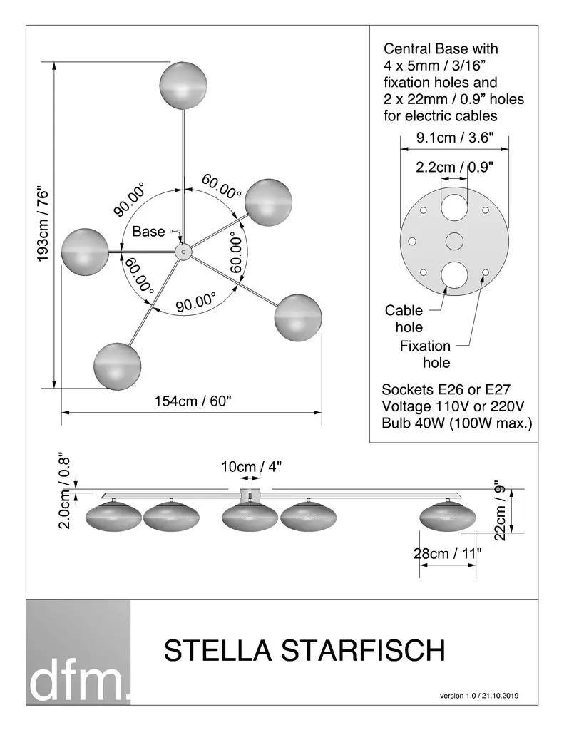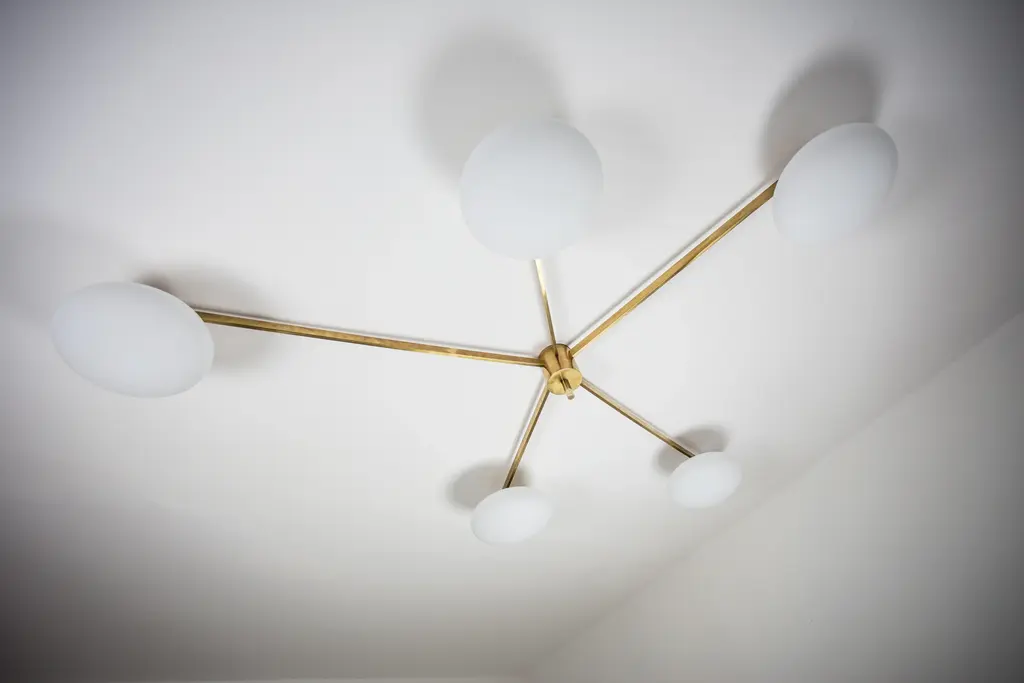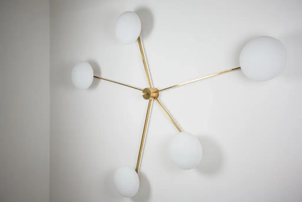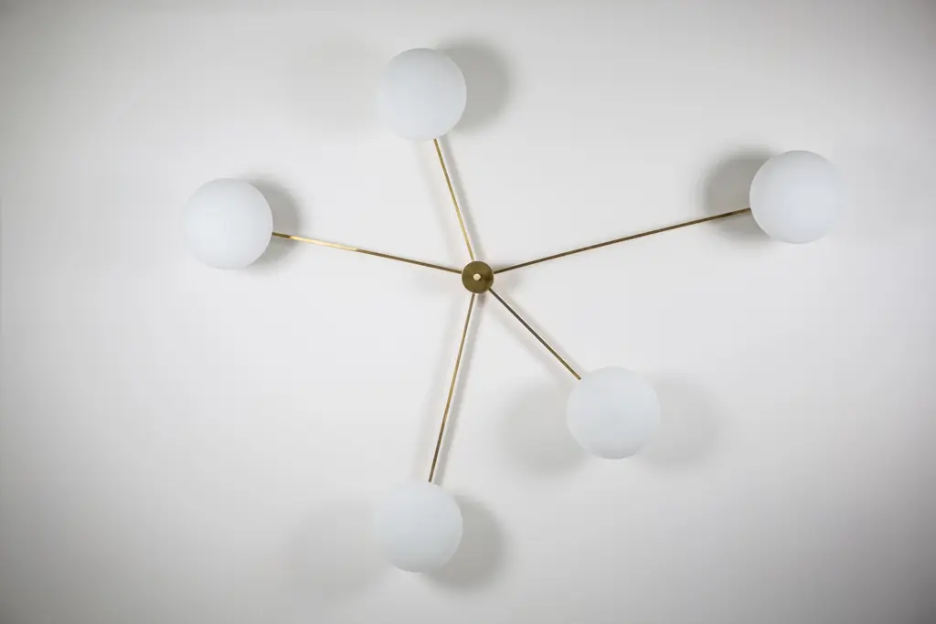 The Stella Starfish Wall / Ceiling Light brings elegance to midcentury design through the inspiration of Italian design - inspired by Angelo Lelli. A handmade Brass body is arranged in an innovative pattern to display a collection of opaque glass diffusers. Once illuminated, the Stella Starfish shines with luster and instantly adds sophisticated ambiance to your space. BRASS FINISH Available with different brass finishes : Blackened, Bronze, Chromed Lucid, Chromed Opaque, Polished, Polished Brushed, Unpolished Balanced, Unpolished Lucid, and Unpolished Opaque finish. I will be in touch with you post purchase to determine the exact brass finish you want - We are offering 9 brass finishes - please refer to product listing pictures. Canopy diameter 4 inches + base plate of 6 inches to cover larger JBox.. Size: 60"W x 9"H Wiring: Built for U.S. with exclusively UL listed electric components - voltage (120 V, 60Hz) with standard U.S. sockets (E26). 100W maximum per bulb. Compatible with LED. Dimmable. Light bulbs are not included. Total Wattage: 500 watts Handmade in Italy. Materials: Glass Brass MMDESIGN DEPARTMENT is a furniture broker for Interior Designer and Architects based in USA. All our lighting are completely rewired for USA with UL electric components. Chairish pricing disclosed is always including shipping (and shipping insurance) at your home address in USA by DHL Express. Shipping is delivered within 10 days after order confirmation.