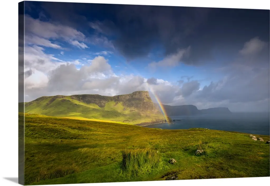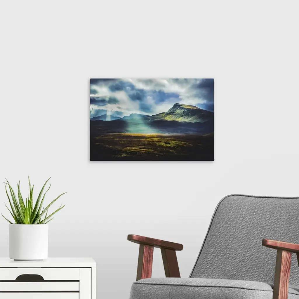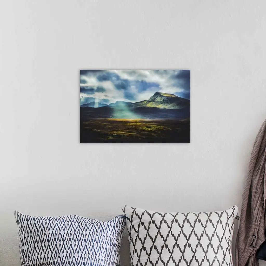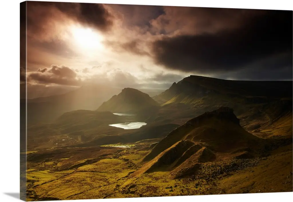 Rays of sunlight on Scottish the Quiraing mountains on the Isle of Skye.