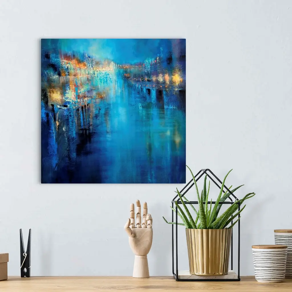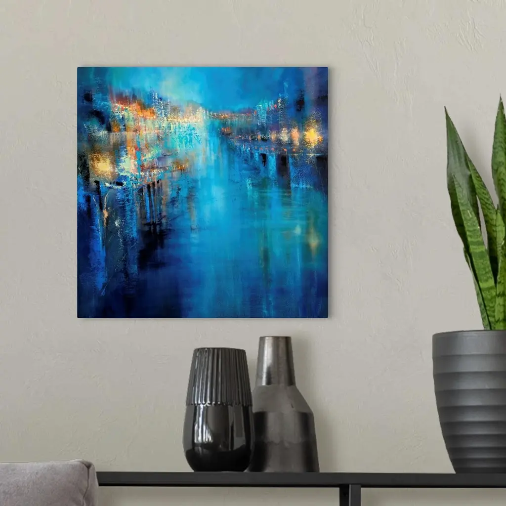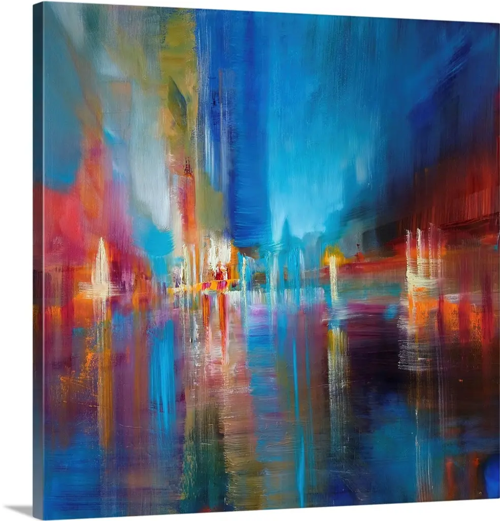 Abstractly painted cityscape near the sea in bright colors and structures: a large, lively city in red, orange and blue with the silhouette of skyscrapers. Reflection of the lights in the water.