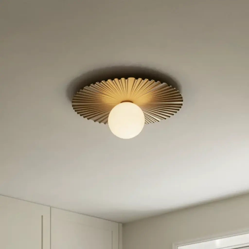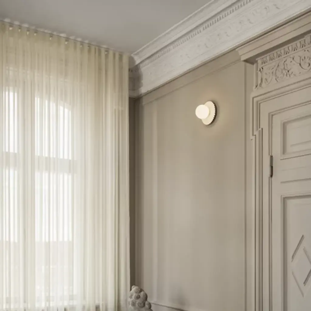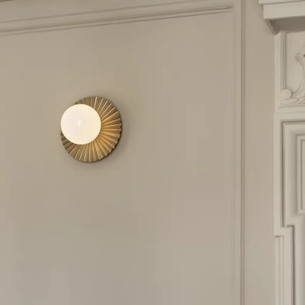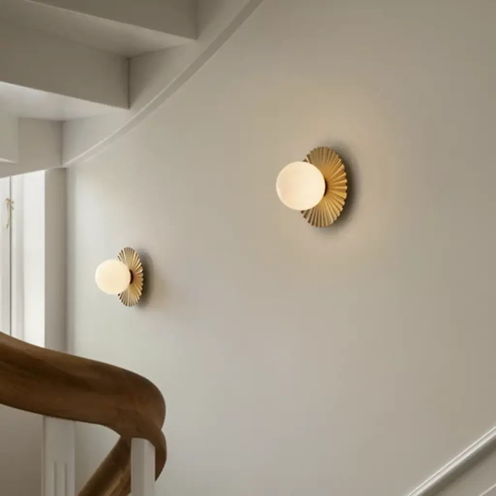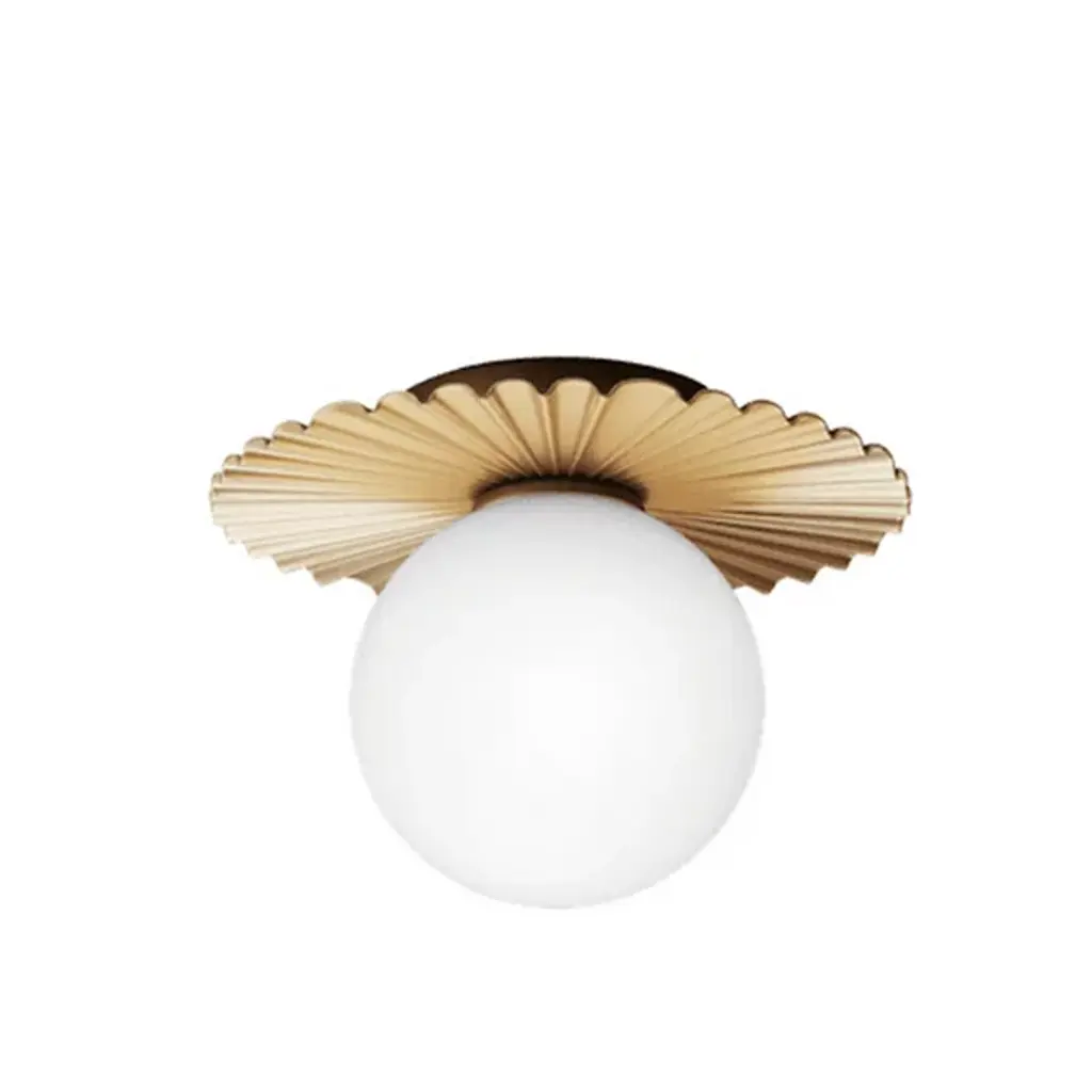 The Liila Muuse Wall / Flushmount from Nuura brings a playful, artistic touch to the Liila series, enhancing its signature floating aesthetic. This wall and ceiling lamp features a large, textured back plate in golden metal paired with a smaller opal-white glass globe. The contrast between the wavy texture and the soft, organic form adds depth and visual intrigue. Perfect as a semi-flush mount in entryways or foyers, this fixture adds a charming and expressive statement to any space.