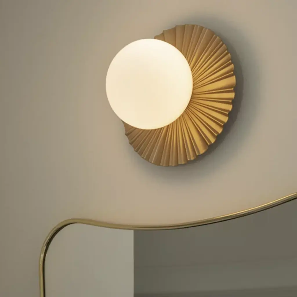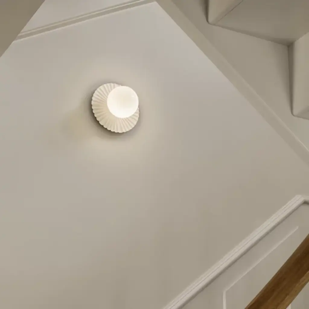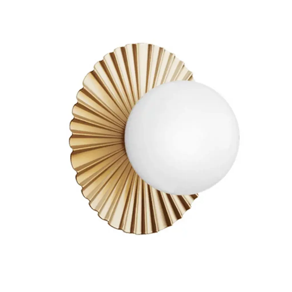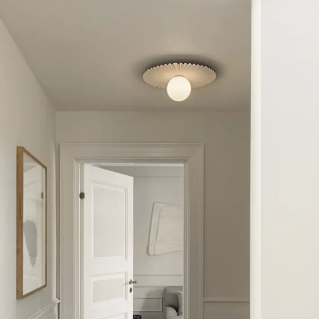 The Liila Muuse Wall / Flushmount from Nuura brings a playful, artistic touch to the Liila series, enhancing its signature floating aesthetic. This wall and ceiling lamp features a large, textured back plate in golden metal paired with a smaller opal-white glass globe. The contrast between the wavy texture and the soft, organic form adds depth and visual intrigue. Perfect as a semi-flush mount in entryways or foyers, this fixture adds a charming and expressive statement to any space.