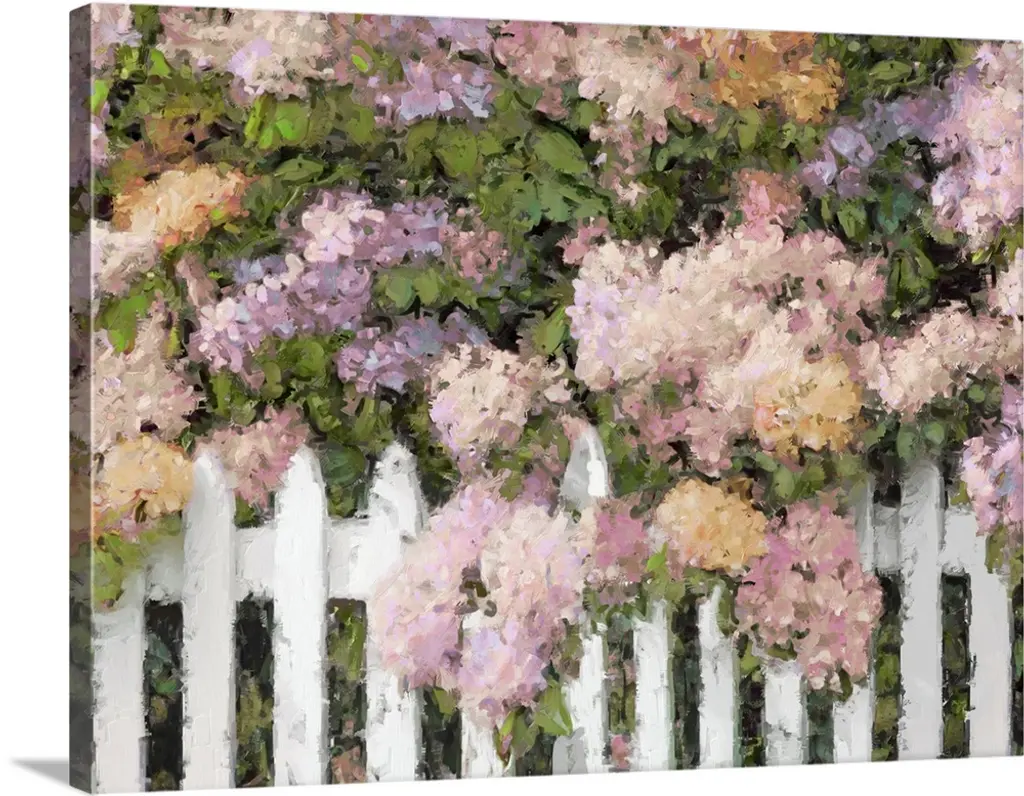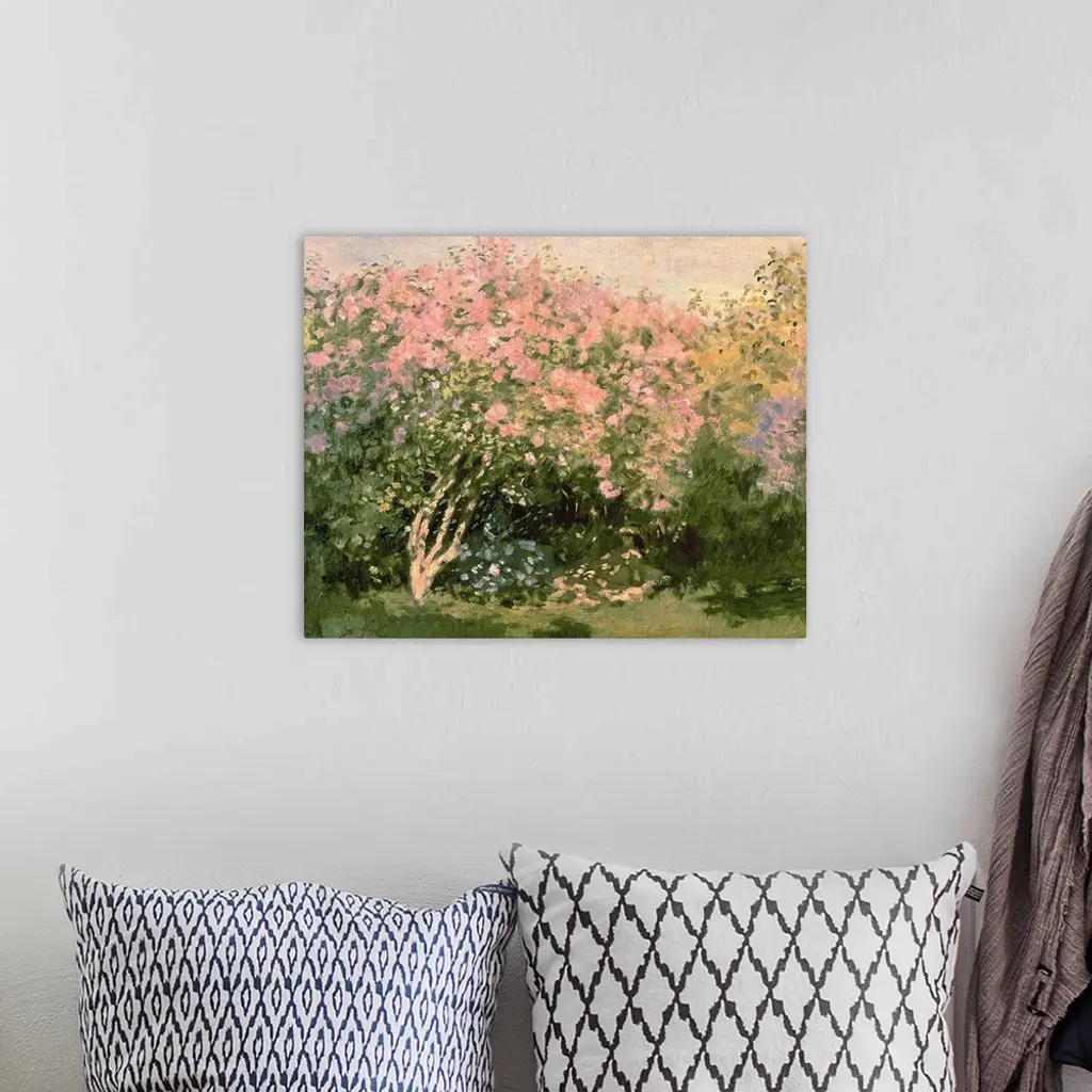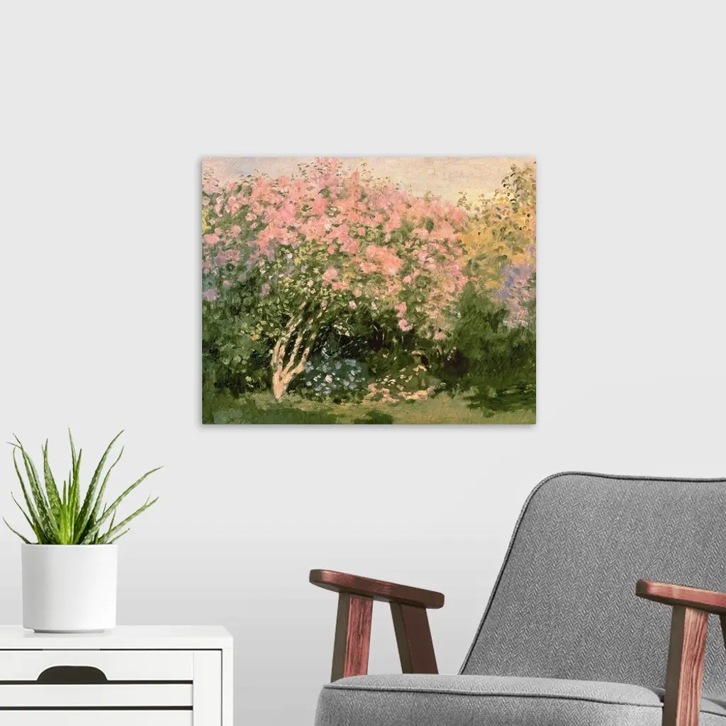 Giant classic art depicts a few lush trees enjoying the sunlight while surrounded by bushes and groups of flowers. Artist uses a lot of short brush strokes in this piece.