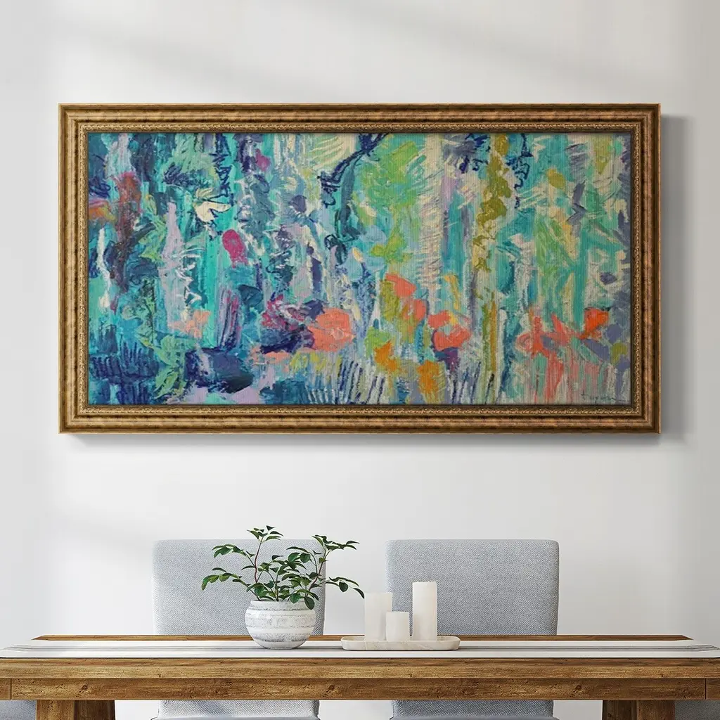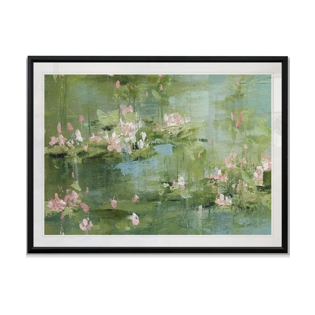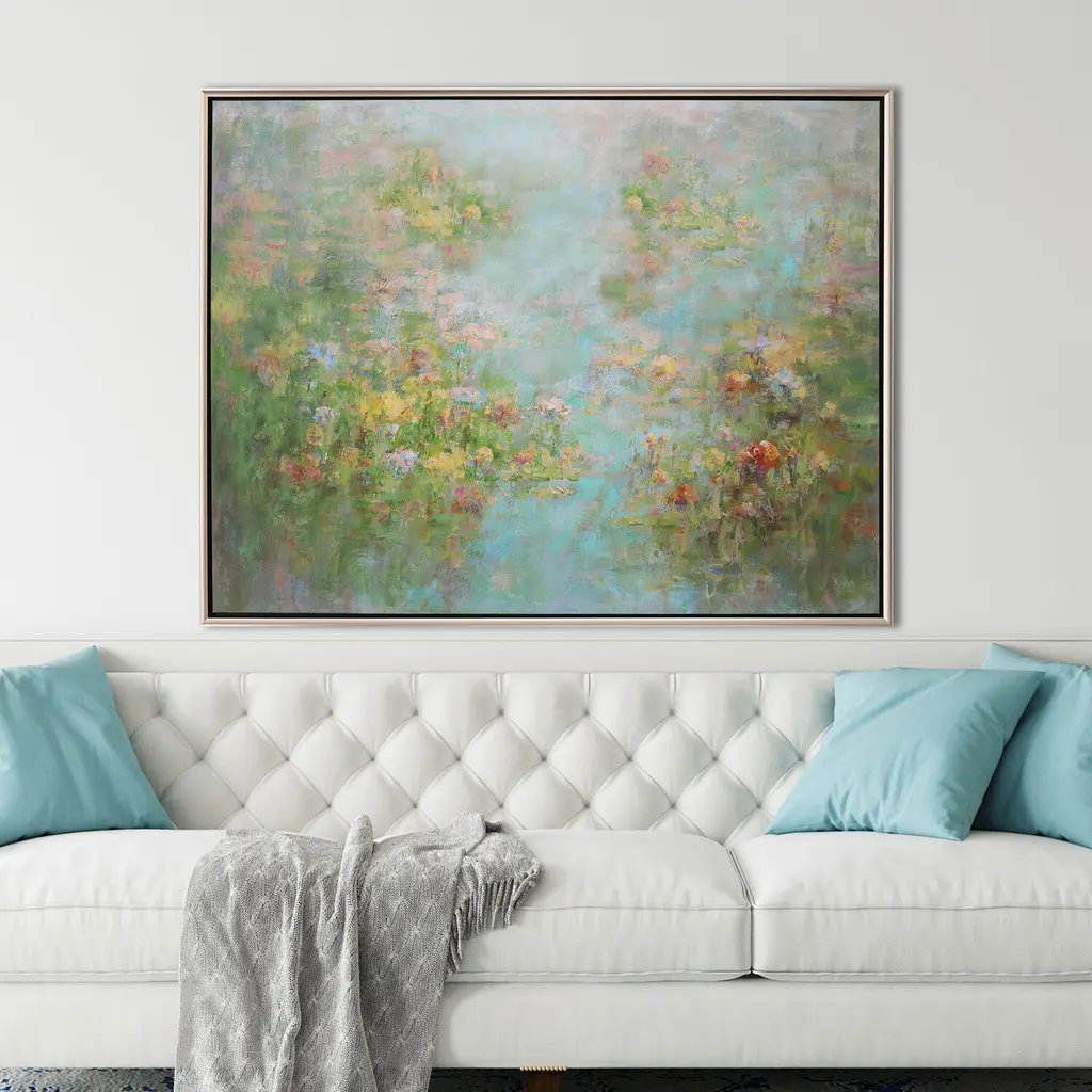 Beautiful water lilies feature a hand applied enhanced gel finish. Canvas is mounted in a warm silver floater frame with satin black side.