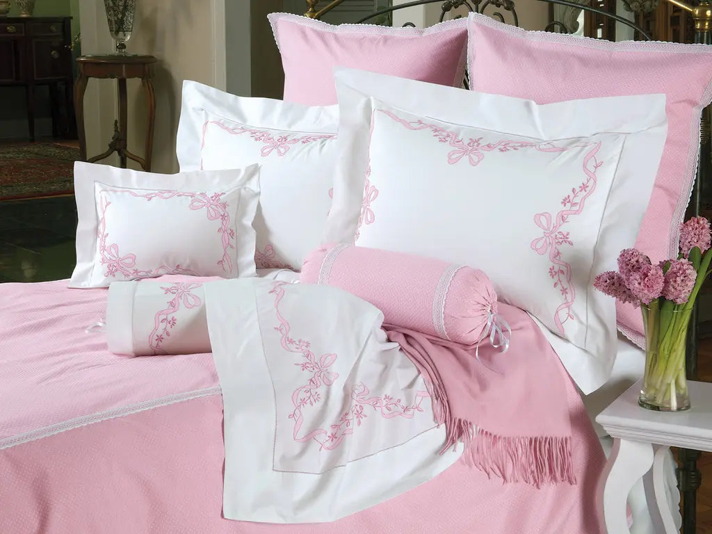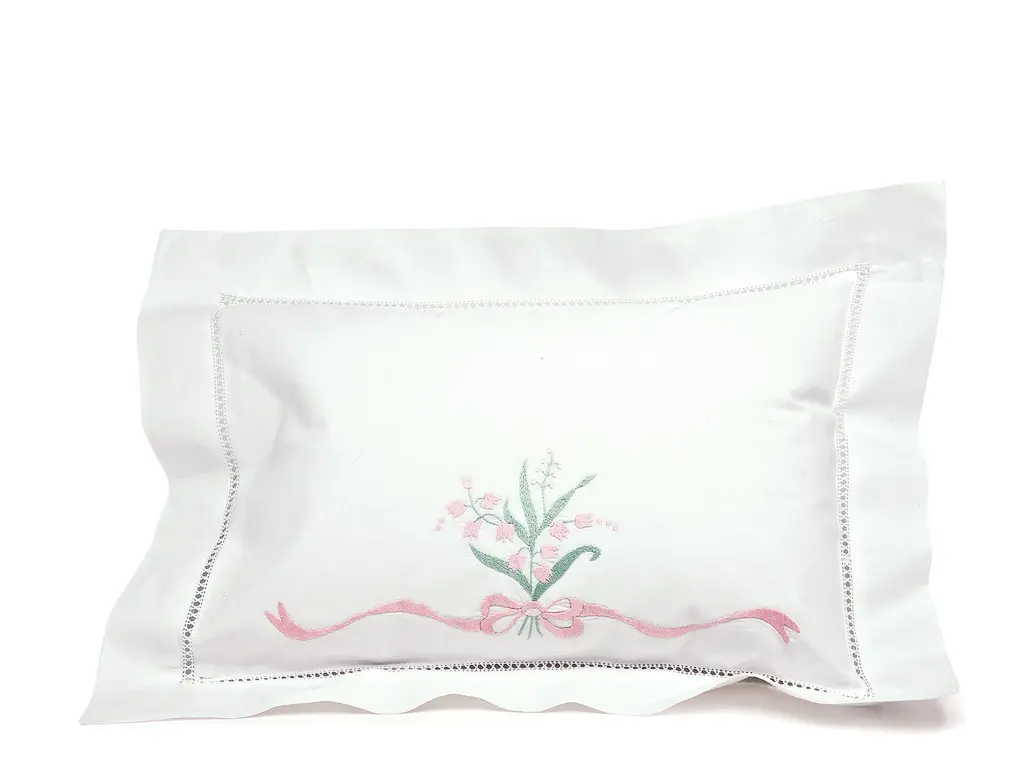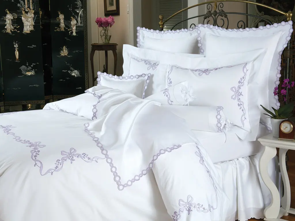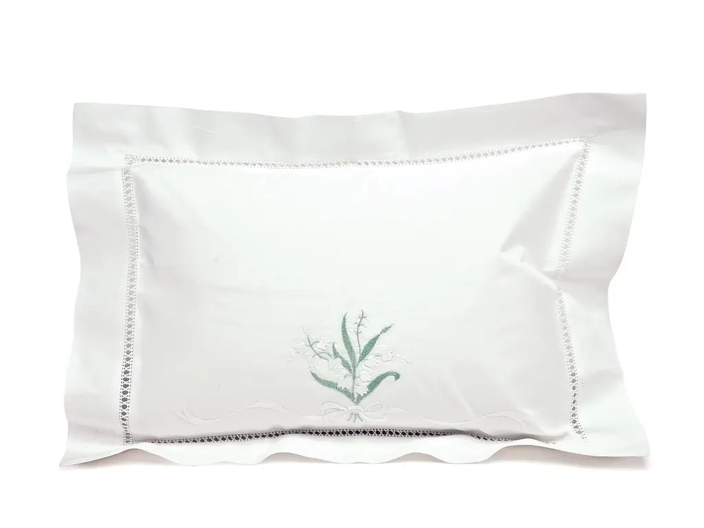 There is no mistaking the precious look of handcrafted linens. It shows up in delightful hand-embroidered nosegays of Pink or White lilies of the valley with satin-stitched ribbons, and patiently done hemstitching. Lustrous White Egyptian cotton sateen, 600 thread count is woven in Italy with the sensuous feel of silk, with lovely scalloped edges. Imported with delicately scalloped edges.