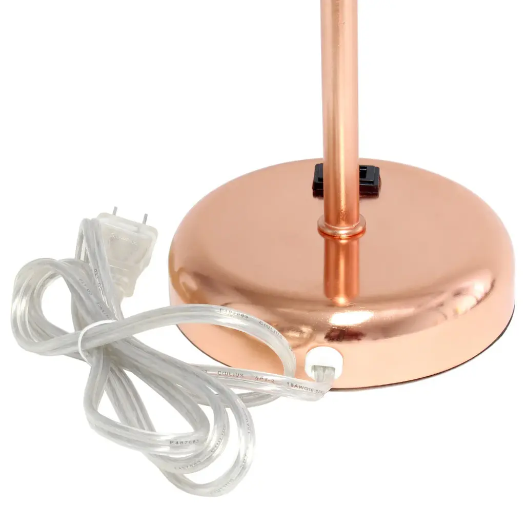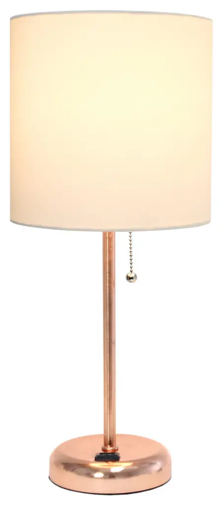 LimeLights Rose Gold Stick Lamp with Charging Outlet and Fabric ShadeThis fun and fashionable lamp features a rose gold base and a fabric shade. It comes equipped with a 2 prong outlet seated in the base for use to charge mobile phones, handheld games, tablets, and other small electronics. This lamp will add a fabulous flair to any room. Perfect for bedrooms, kids and teens, college dorms, nurseries, or fun offices!Bulb Type : Incandescent (A-19)Switch Type : Pull switchSwitch Location : SocketShade Diameter : 8.5Shade Top Opening : 8.5Shade Bottom Opening : 8.5Shade Height/ Slant : 8.5Shade Security : Socket NutNumber of Lights : 1Maximum Wattage : 60Shade Material : FabricCord Length : 5''Finish/Color : ROSE GOLD BASE/WHITE SHADEPrimary Material : MetalMaterial Breakdown : fabric 25% iron 69%,plastic 6%Base Type : E26 Medium BaseBase Dimensions : 14.25x5.25x5.25Height from Base to Socket/Shade : 11Bulb Included : NoETL CERTIFIEDRose gold base with Charging OutletFabric ShadePerfect for bedrooms, kids room, college dorm, nursery, or fun officeShade Diameter: 8.5"xHeight: 19.5"Uses 1x60W type A medium base bulb (not included)Power Outlet on base for charging your Cell phone, iPod, iPhone, iPad