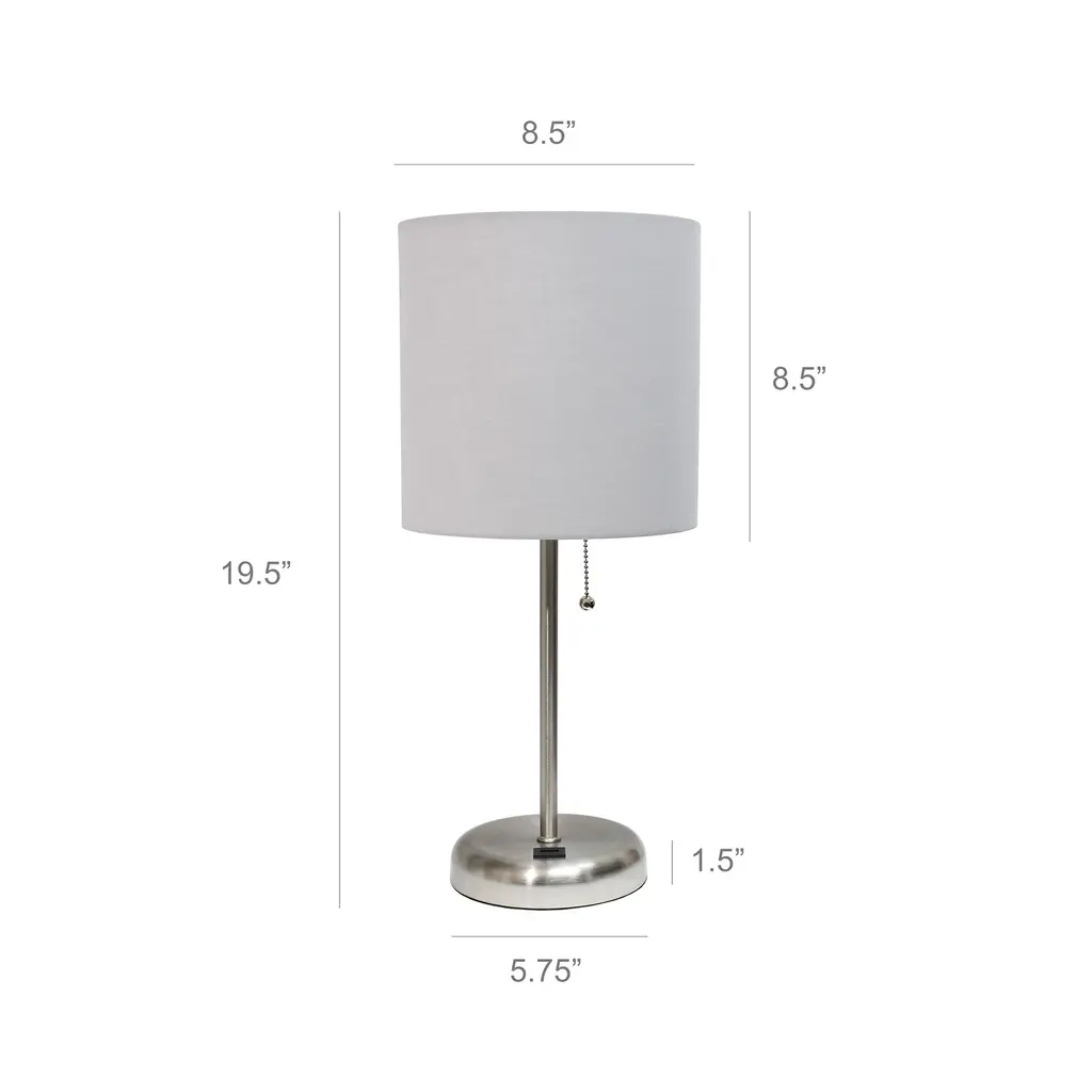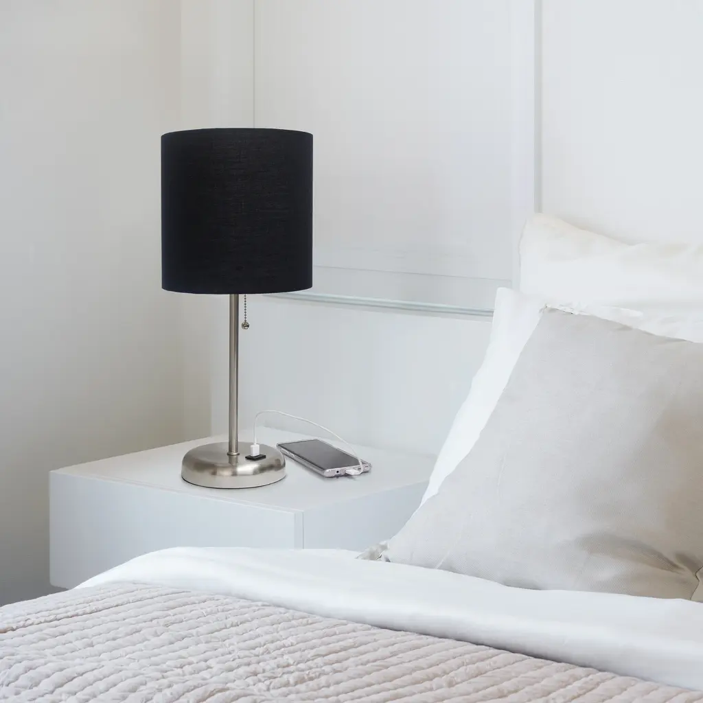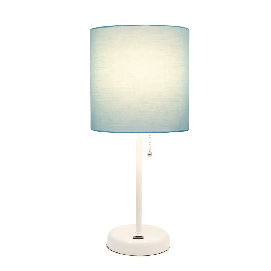 This fun and fashionable lamp features a white base and a fabric shade. It comes equipped with a USB seated in the base for use to charge mobile phones, handheld games, tablets, and other small electronics. This lamp will add a fabulous flair to any room. Perfect for bedrooms, kids and teens, college dorms, nurseries, or fun offices!Features: