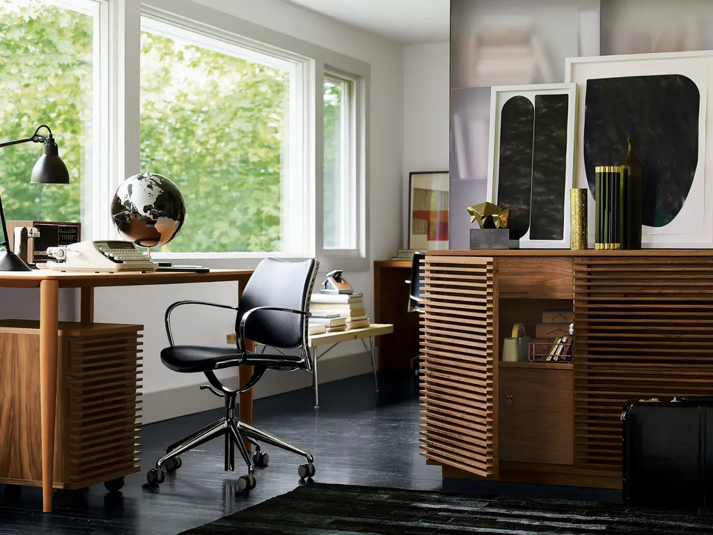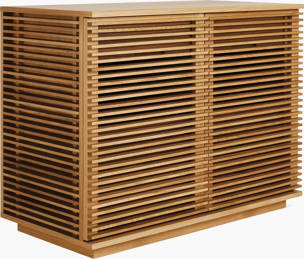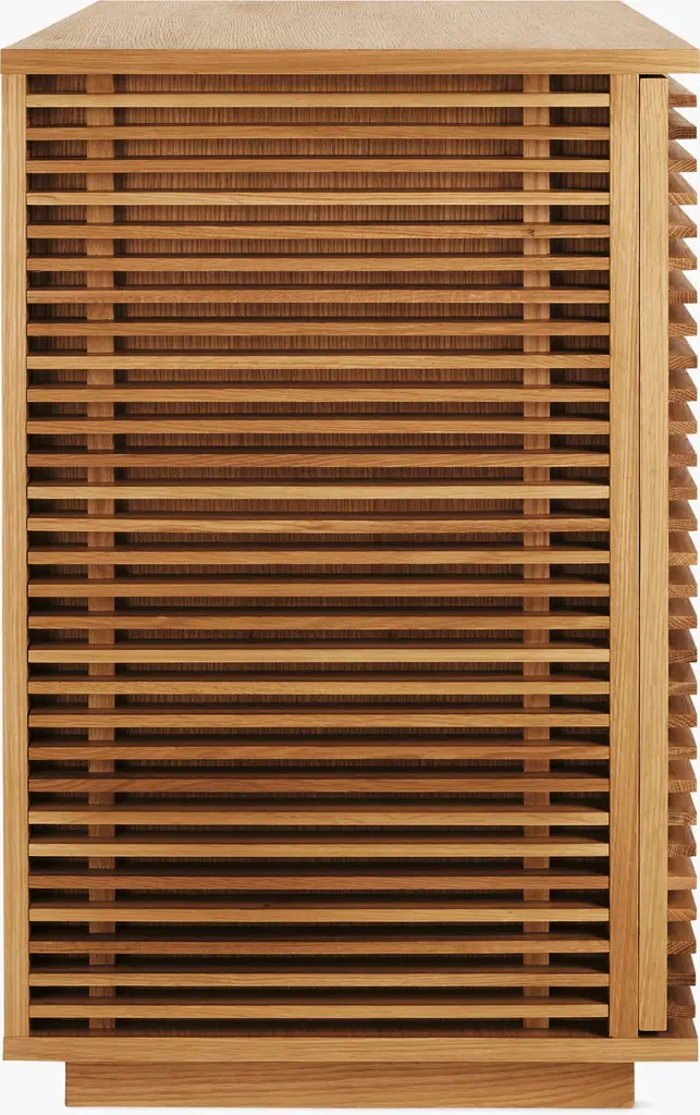 The Line Collection (2012) is distinguished by horizontal lines that lend a sense of restfulness. This louvered design also serves a purpose on applicable units, allowing remotes to control devices inside. Line brings order to electronics, barware, tableware, and even office supplies. Designer Nathan Yong creates pieces that project quiet elegance, for which he credits hectic city living. “My work is a reflection of my yearning for nature in this concrete jungle," he says. Made in Malaysia.