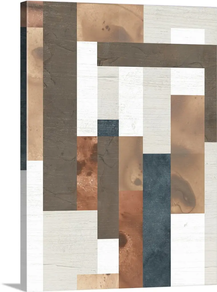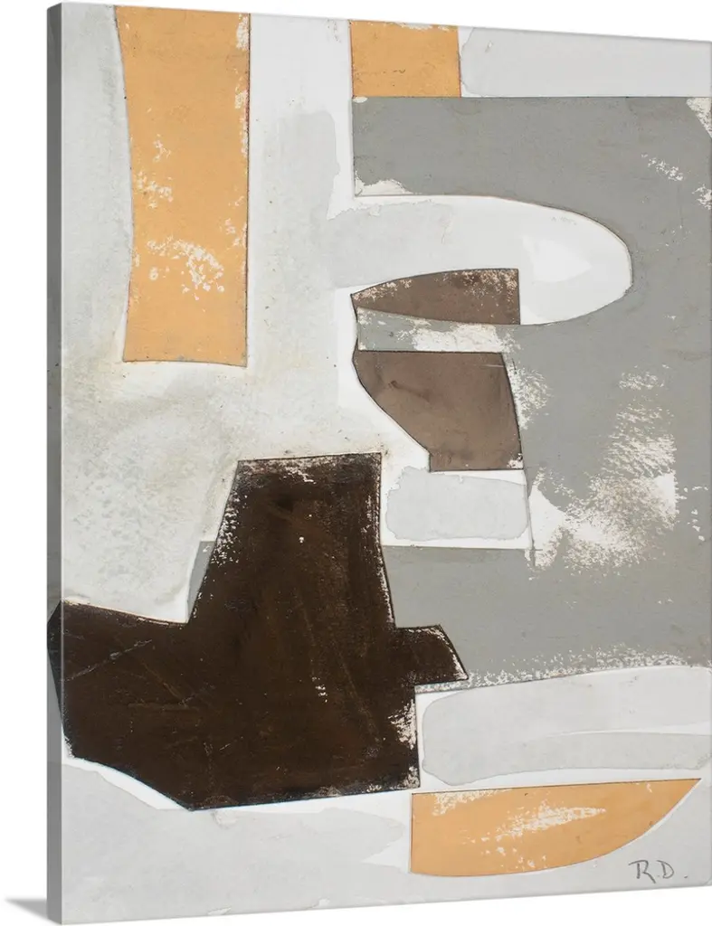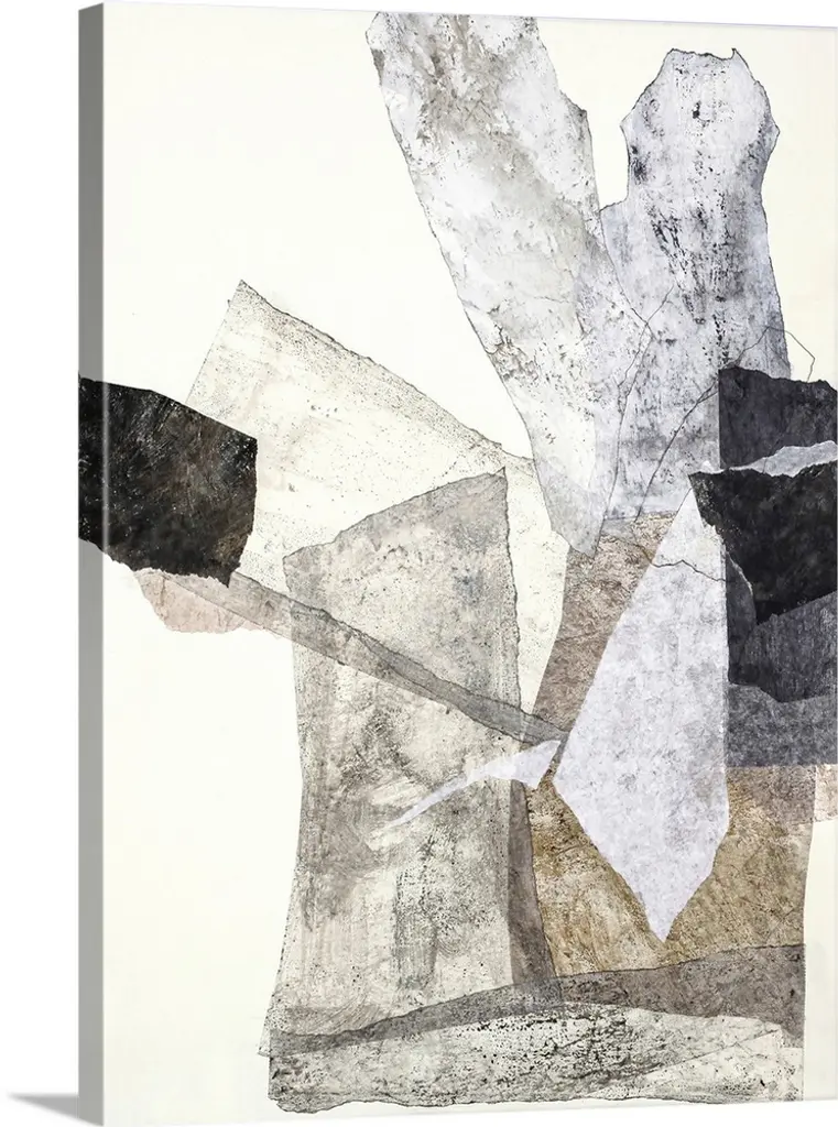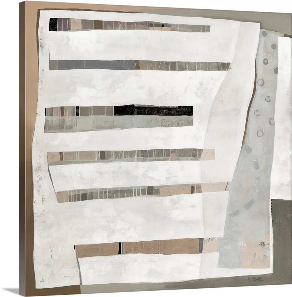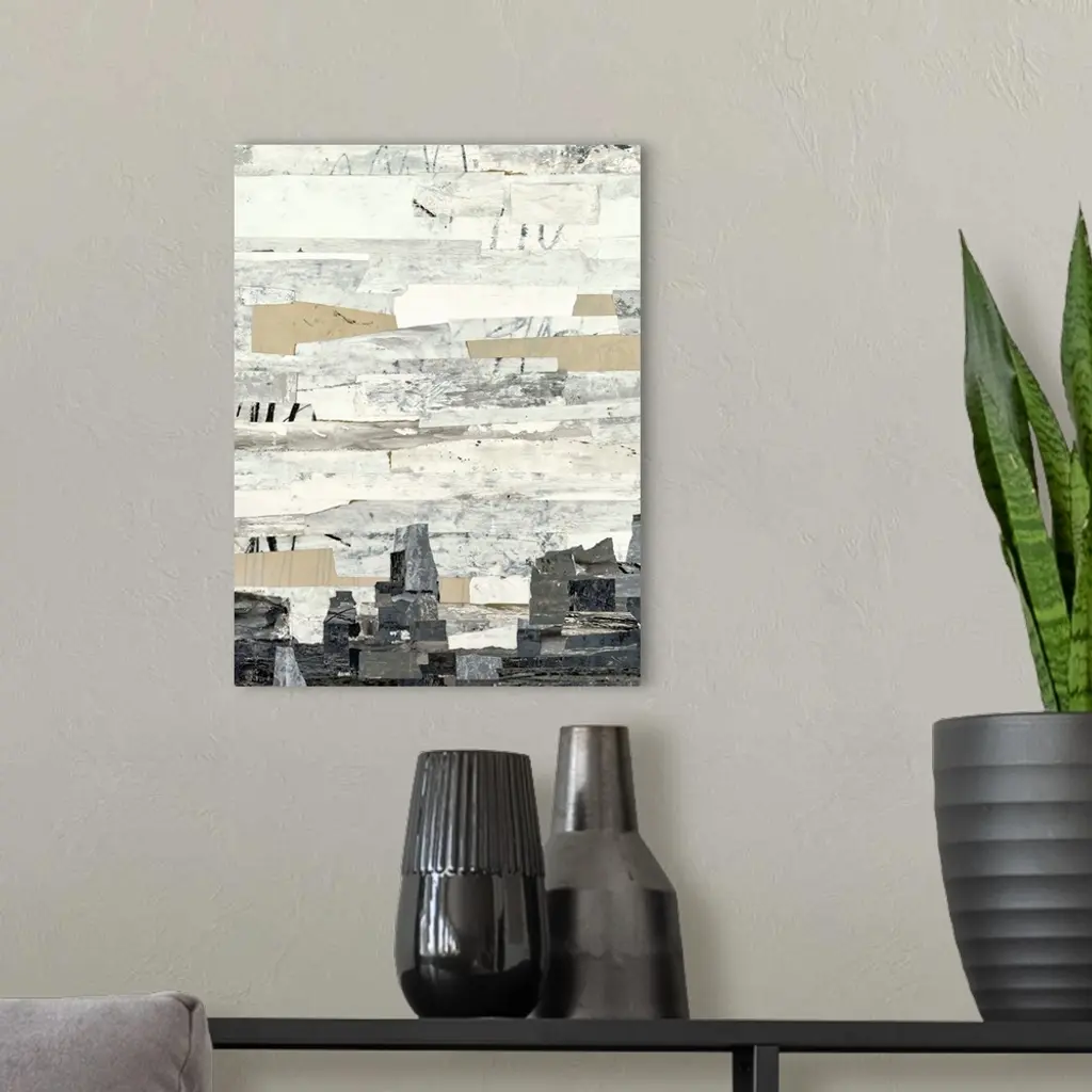 Abstract art with strips of neutral colors pasted together to create a rocky landscape.