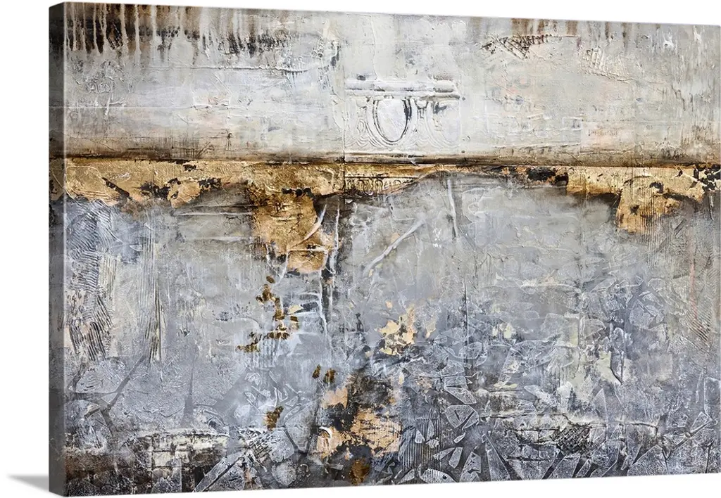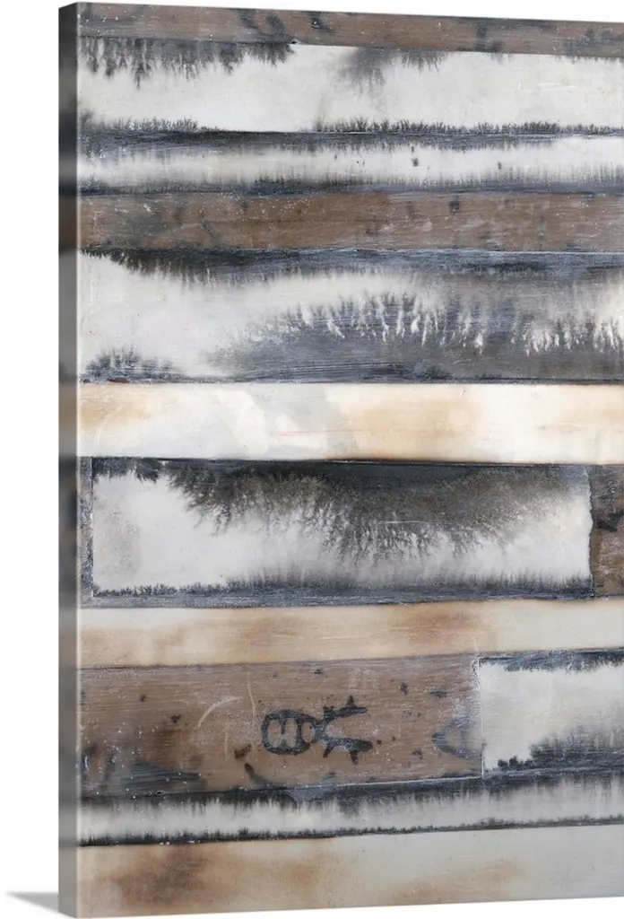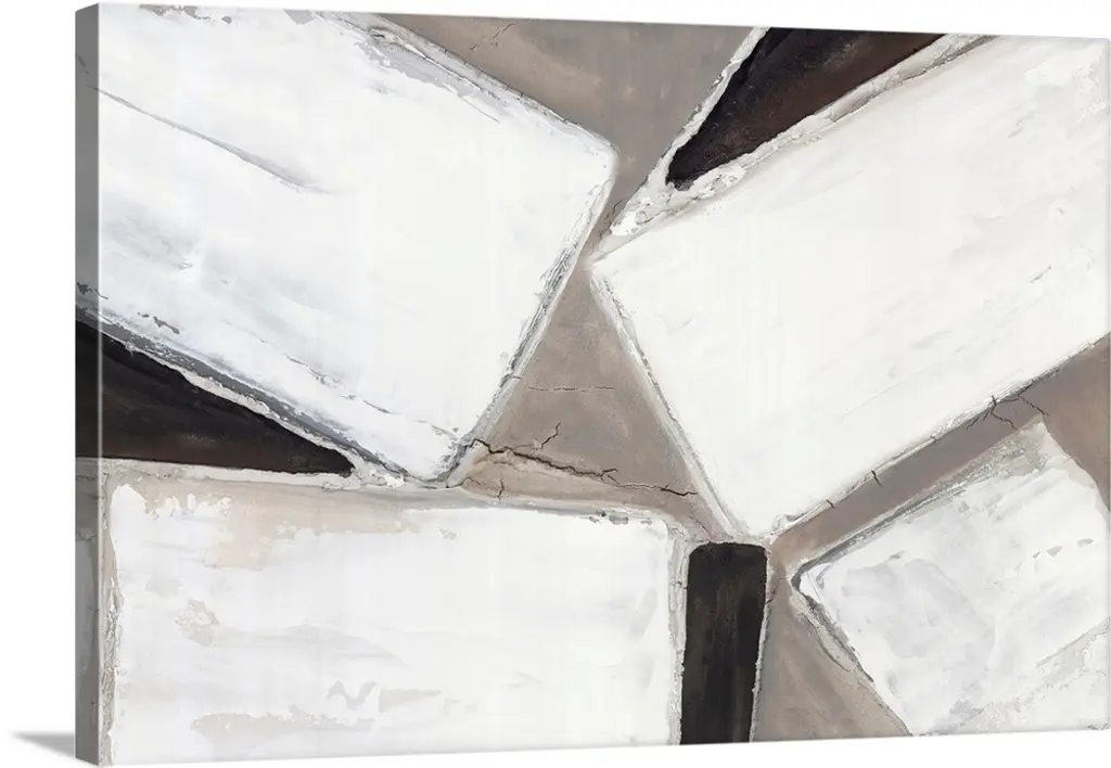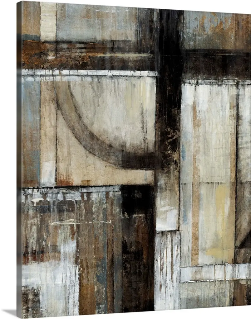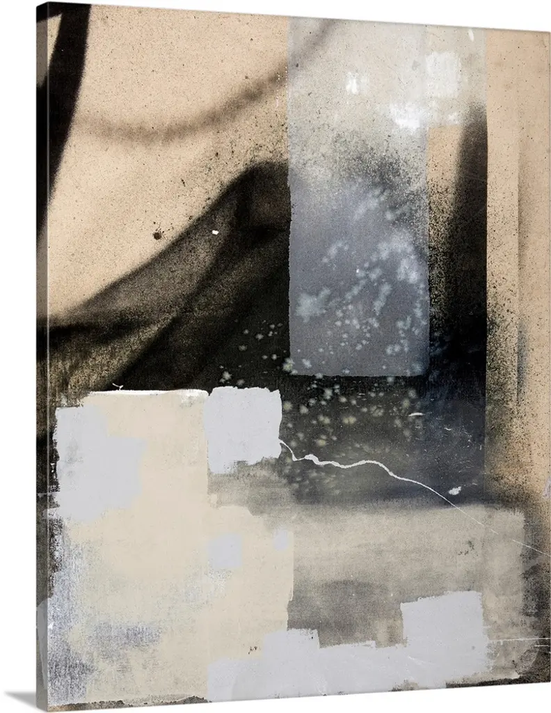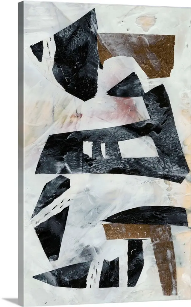 Abstract art with strips of neutral colors pasted together to create a rocky landscape.