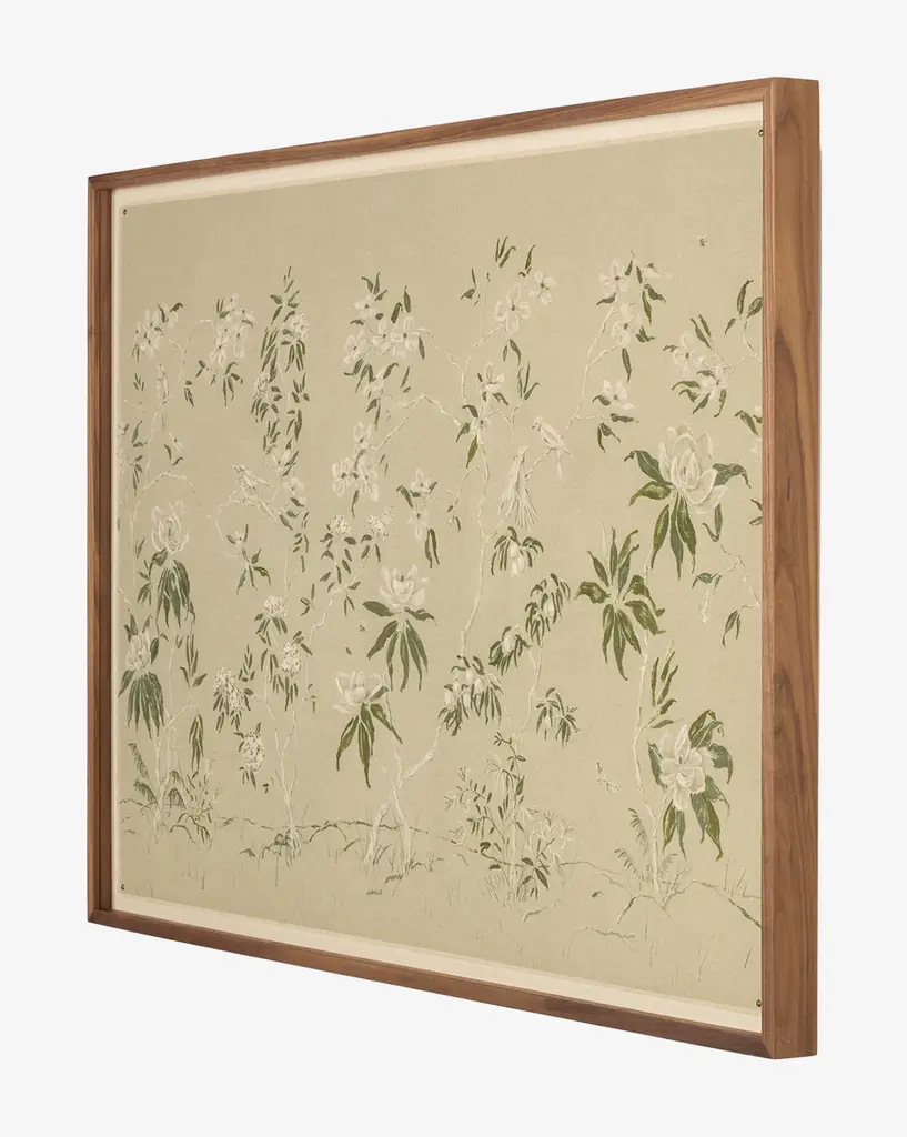 Lauren-Dawn Latshow's Linen Chinoiserie offers a modern interpretation of traditional chinoiserie. Printed on raw canvas, backed with linen, and presented in a rich walnut frame, it brings an elegance and timeless beauty to your home styling.