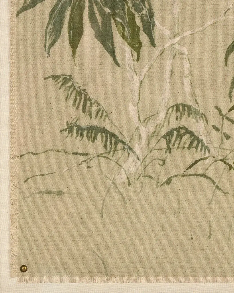 Lauren-Dawn Latshow's Linen Chinoiserie offers a modern interpretation of traditional chinoiserie. Printed on raw canvas, backed with linen, and presented in a rich walnut frame, it brings an elegance and timeless beauty to your home styling.