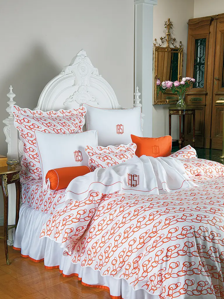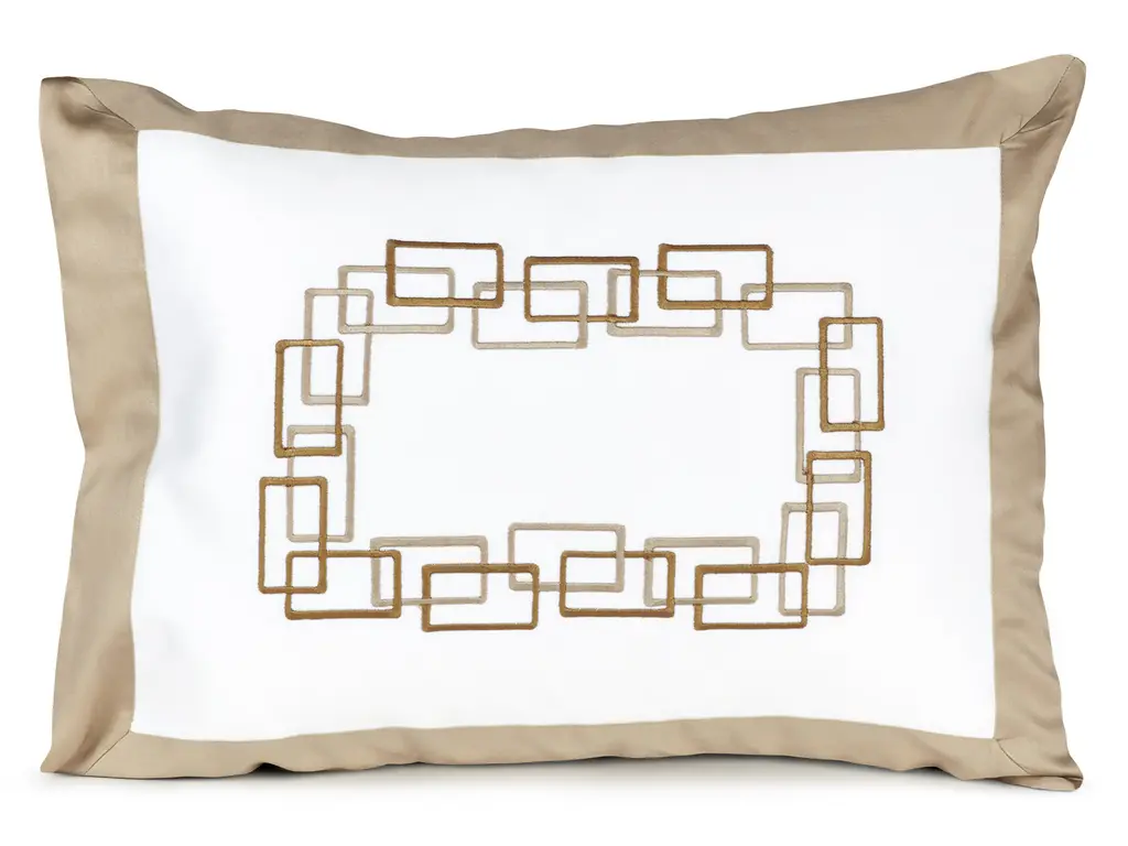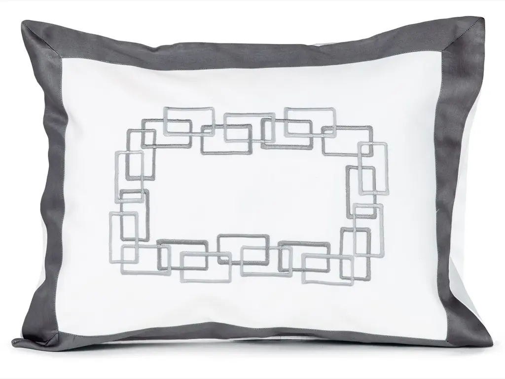 Like the happiest memories link us to our favorite places in life, these linked boxes of alternating Gray or Beige shades will remind you of the harmonious balance that is attainable each and every day. Along with its mood-enhancing qualities, this striking pattern laid out on radiant 600 thread count Egyptian cotton sateen adds a refined element of lavishness to your bedroom. Embroidery in solid color binds together each individual link with splendid solidarity. Design is available in two shades of Gray or two shades of Beige with matching solid taped border and mitered corners. Made in Italy.
