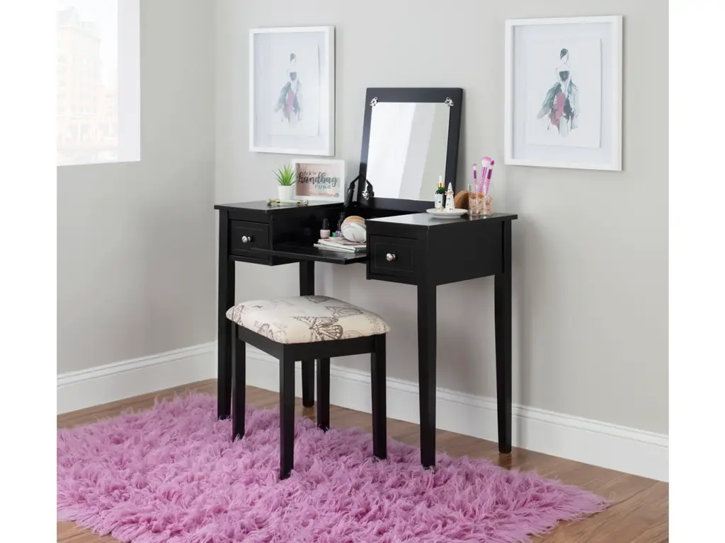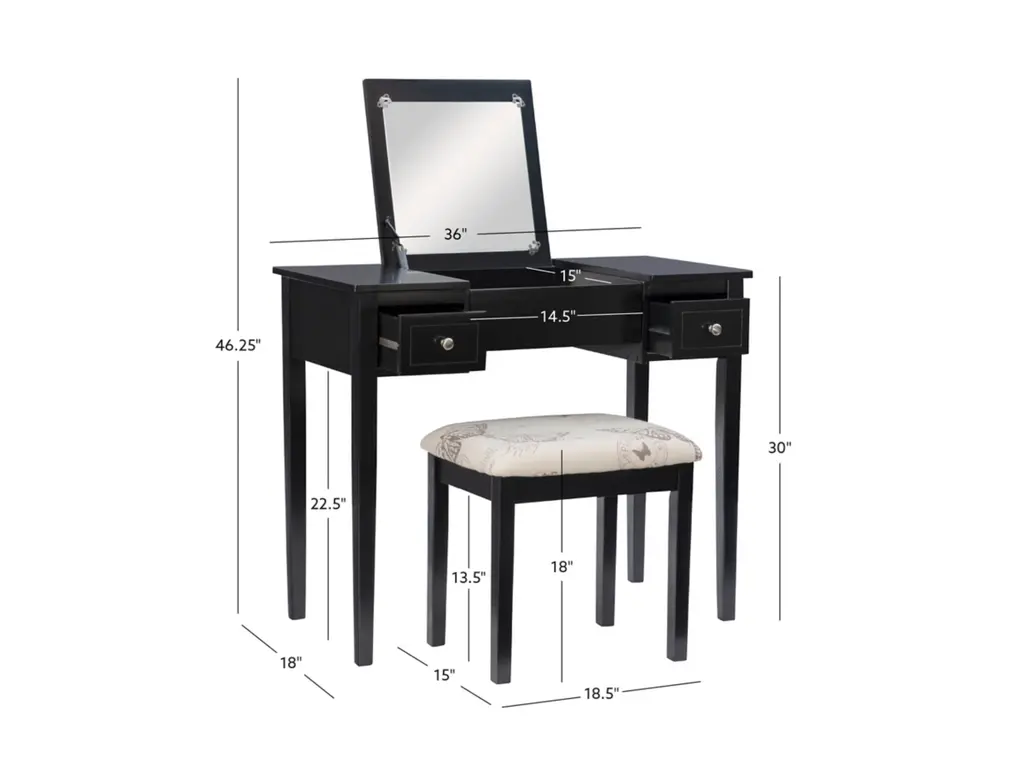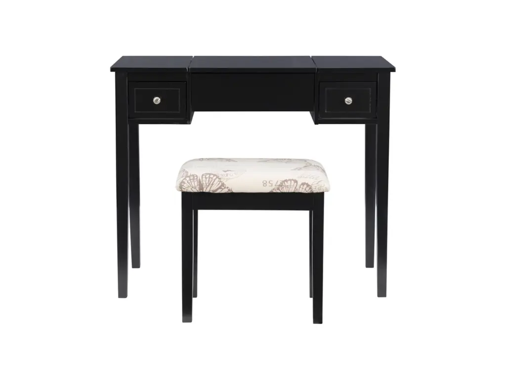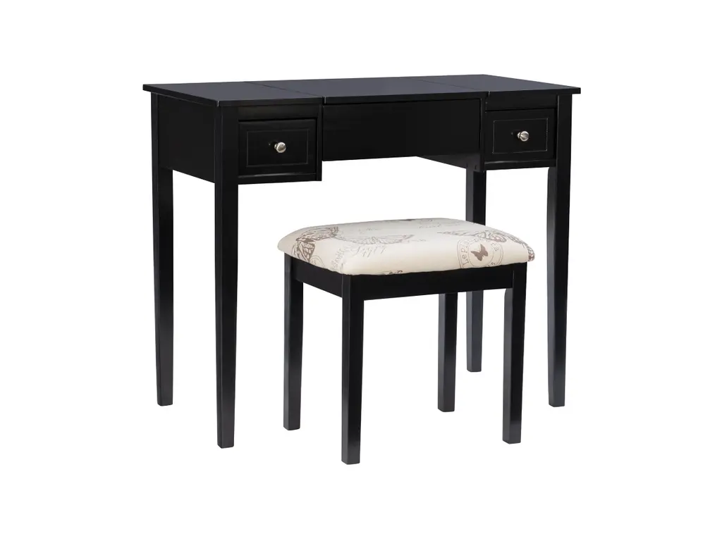 Create a beautiful space that's personal, stylish and full of function with the Black Butterfly vanity set. Its flip top mirror with safety-stay hinge offers lots of versatility. Simply flip the mirror down when not in use and enjoy a handy flat surface. The two drawers are generously sized and the table top is spacious—perfect for storing an array of cosmetics, jewelry and beauty supplies. A flip down front panel opens for easy access to your possessions. A thickly padded upholstered stool is included. Ideal for teens and adults, set up in a bedroom or dressing area.