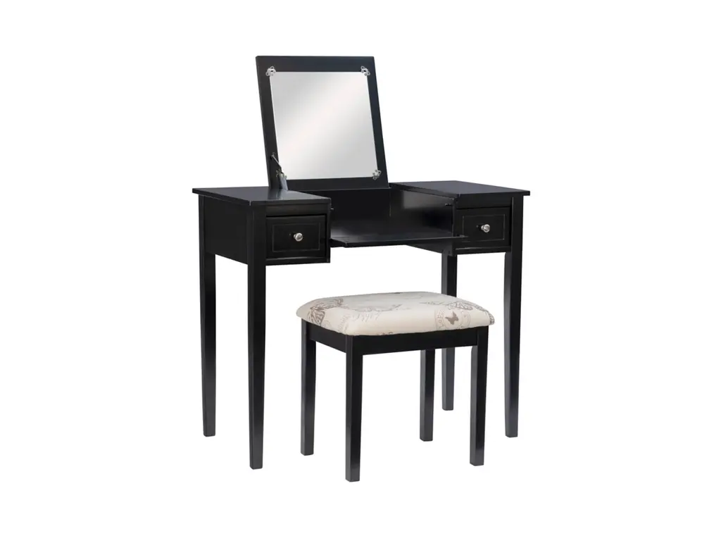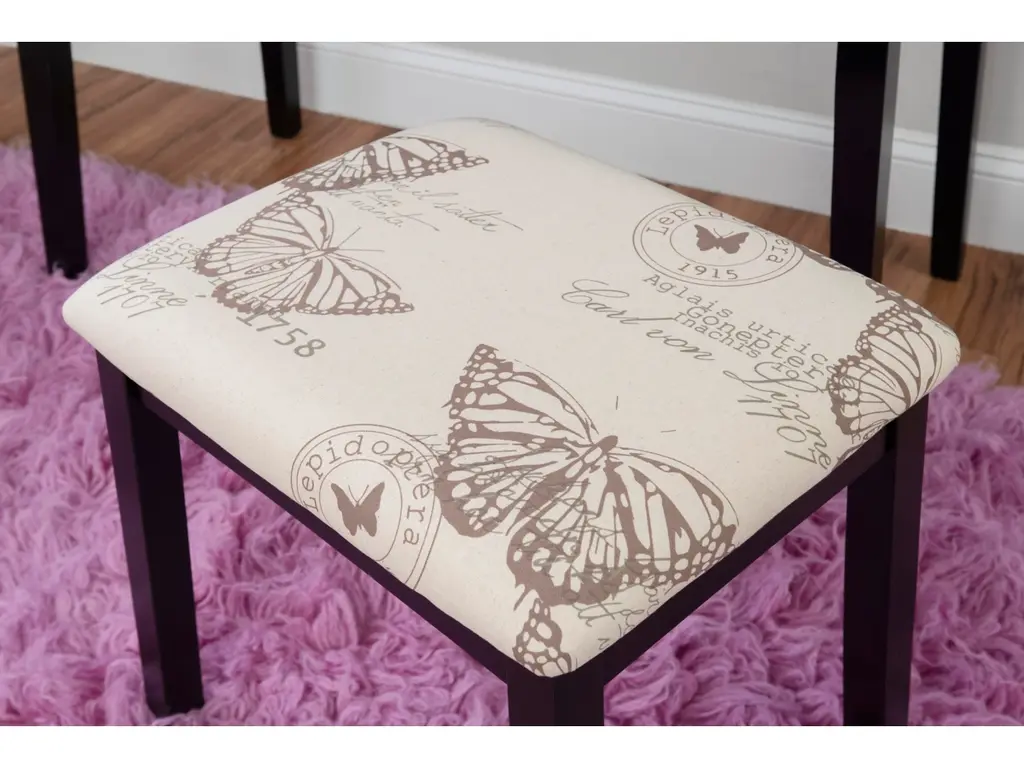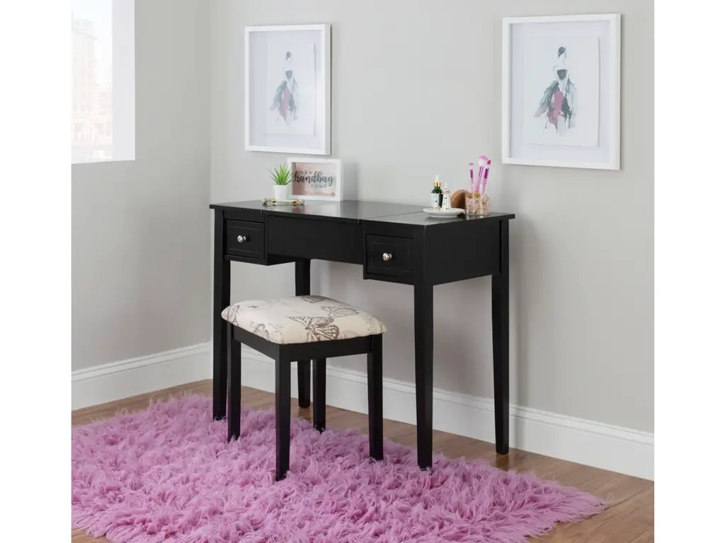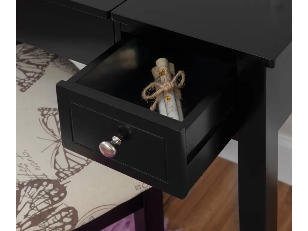 Create a beautiful space that's personal, stylish and full of function with the Black Butterfly vanity set. Its flip top mirror with safety-stay hinge offers lots of versatility. Simply flip the mirror down when not in use and enjoy a handy flat surface. The two drawers are generously sized and the table top is spacious—perfect for storing an array of cosmetics, jewelry and beauty supplies. A flip down front panel opens for easy access to your possessions. A thickly padded upholstered stool is included. Ideal for teens and adults, set up in a bedroom or dressing area.