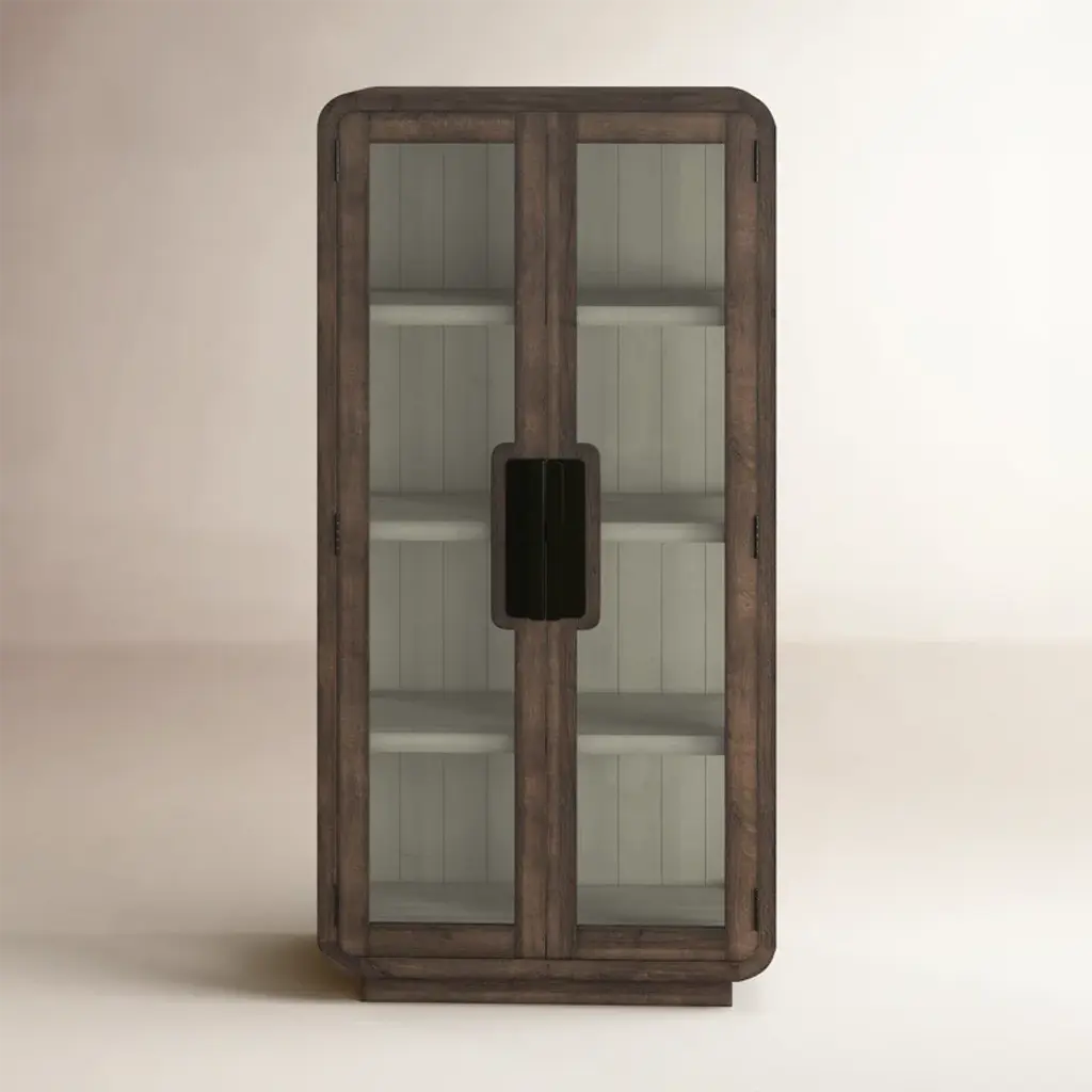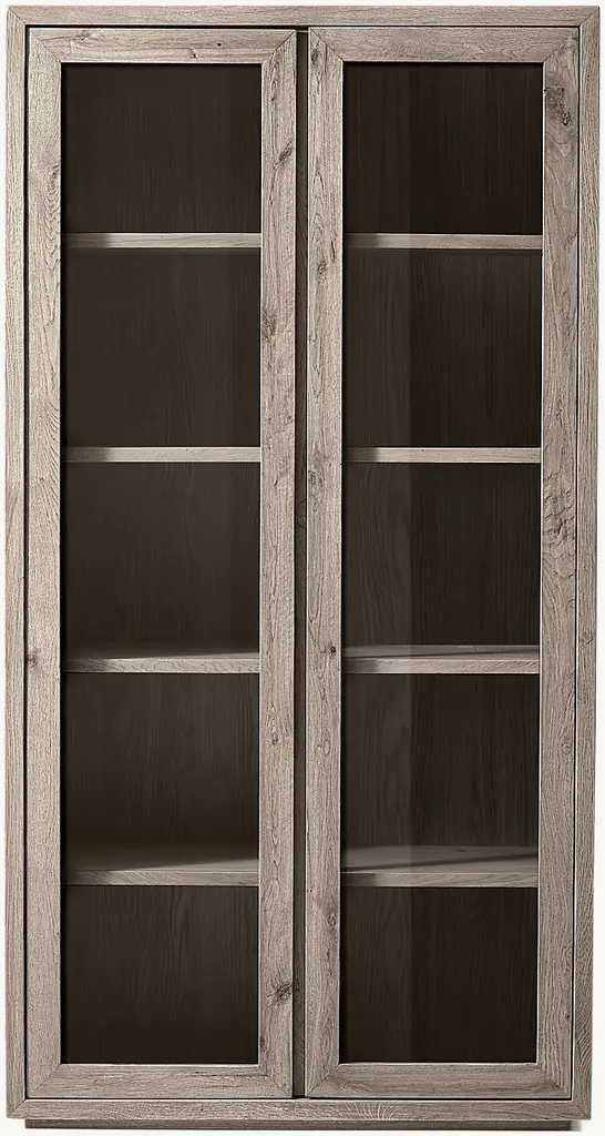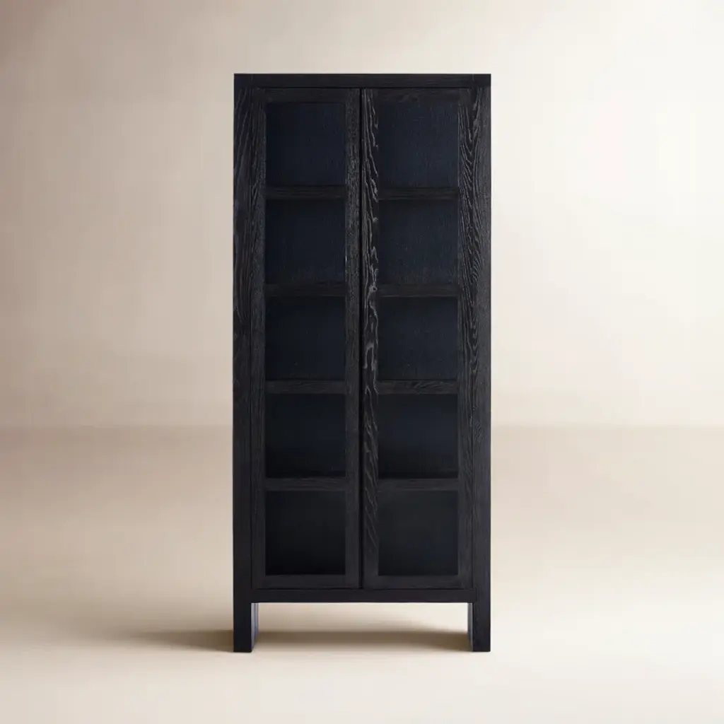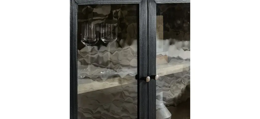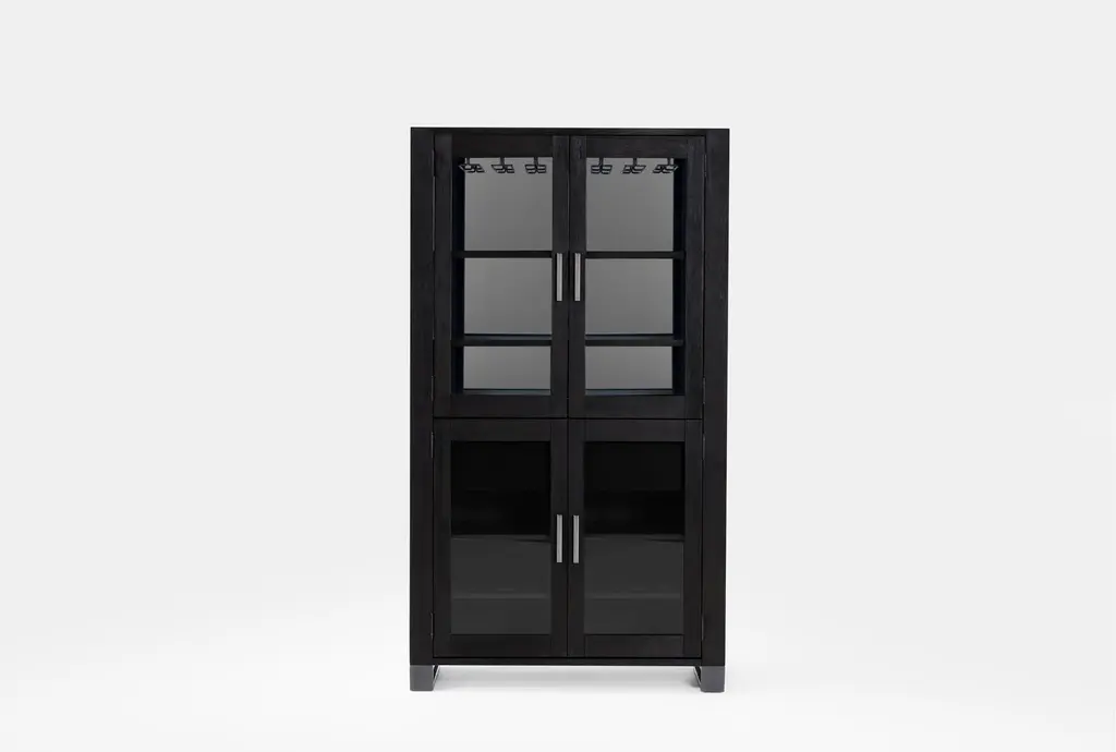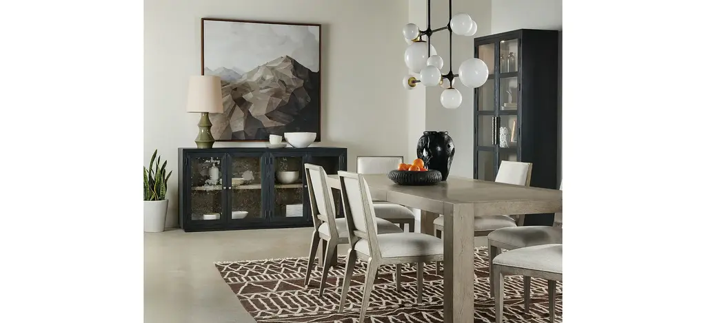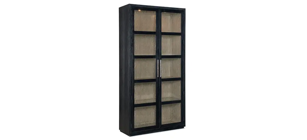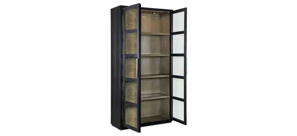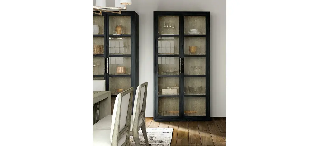 Capturing the essence of nature's organic color palette and the aura of a rustic mountain cottage, Hooker Furniture introduces the Linville Falls Cabinet. The whole home collection is designed for consumers looking for casual and contemporary furniture. It is featured in a soft Smoked Gray finish mixed with a Charred Black finish that is achieved through Shou Sugi Ban, a Japanese technique that creates an elegant burnt wood look. With Two puck lights in top with three-intensity touch switch on right side back panel and wood-framed glass shelves.