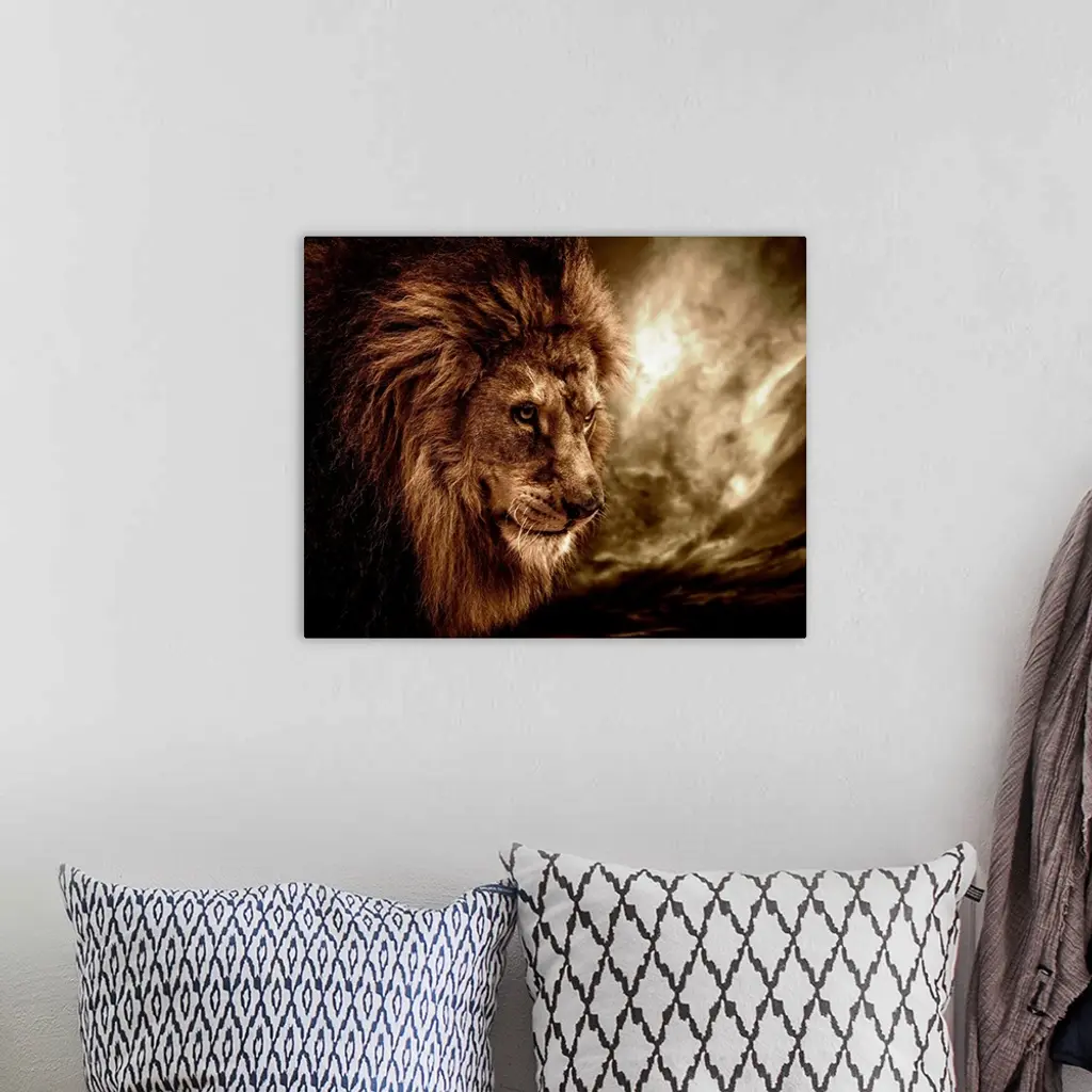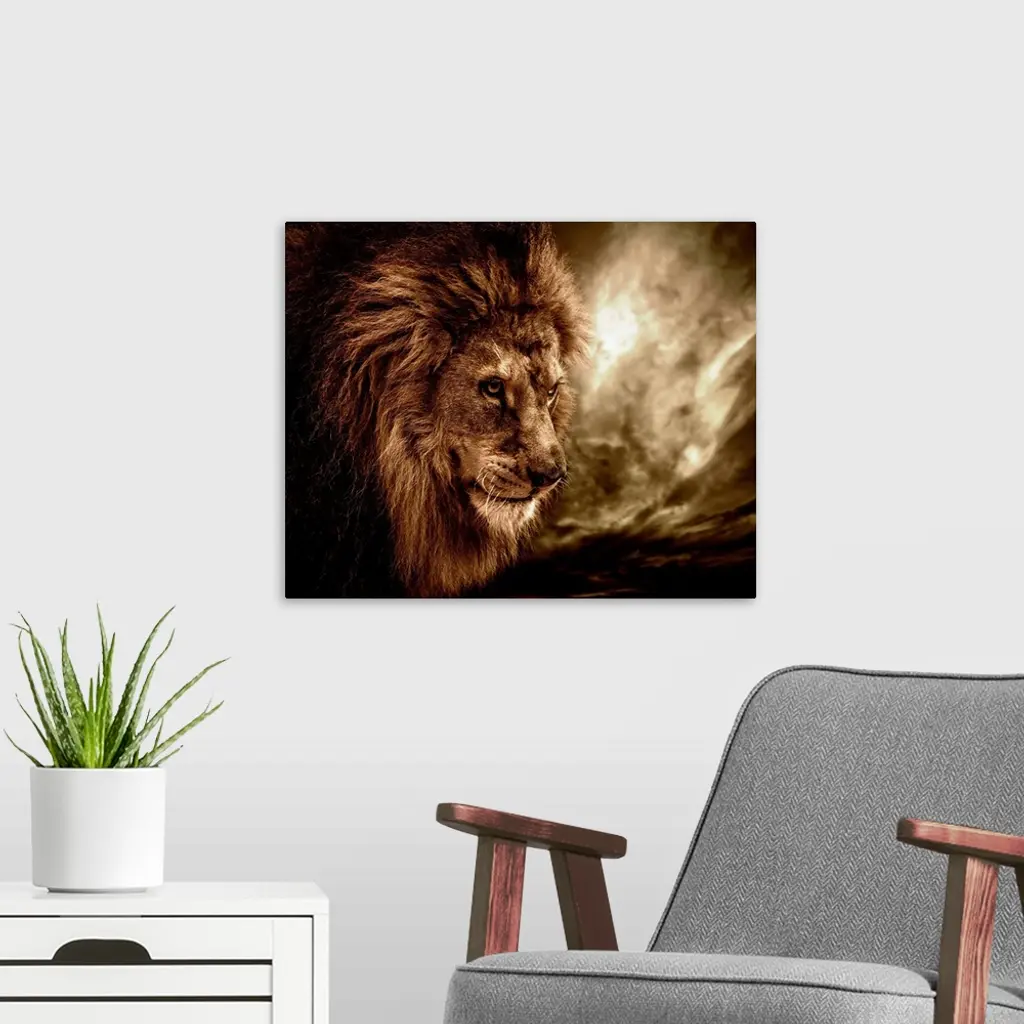 Lion against stormy sky wall art for home and office decor. Discover canvas art prints, photos, mural, big canvas art and framed wall art in GreatBigCanvas.com's varied collections.