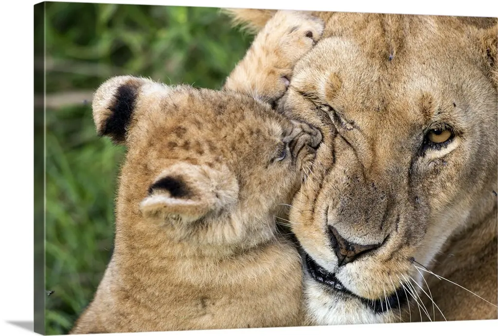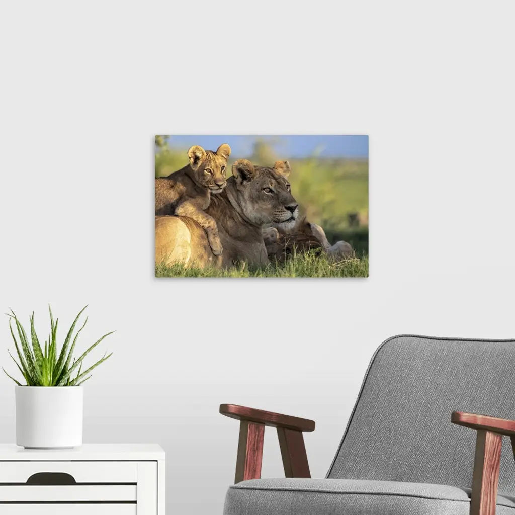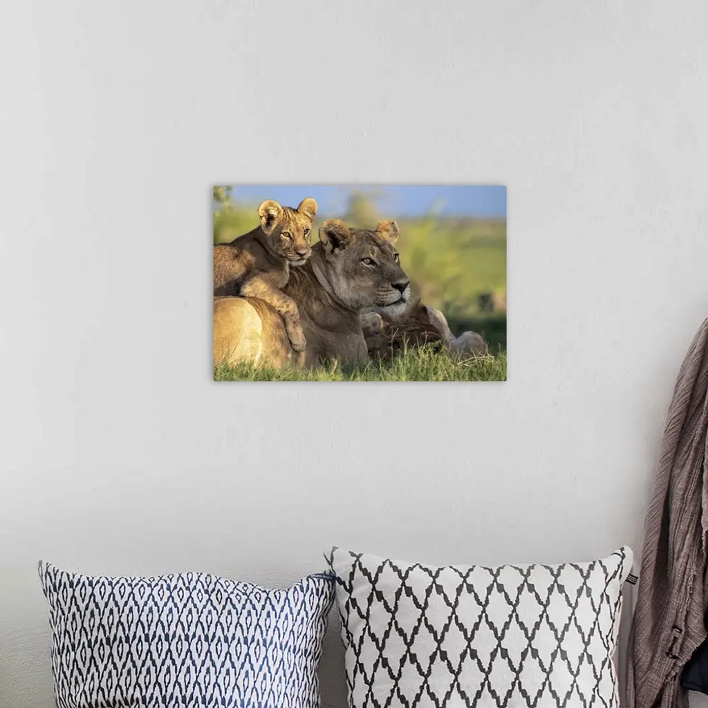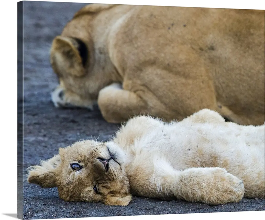 Lion Cub Lying On Its Mother, Okavango Delta, Botswana