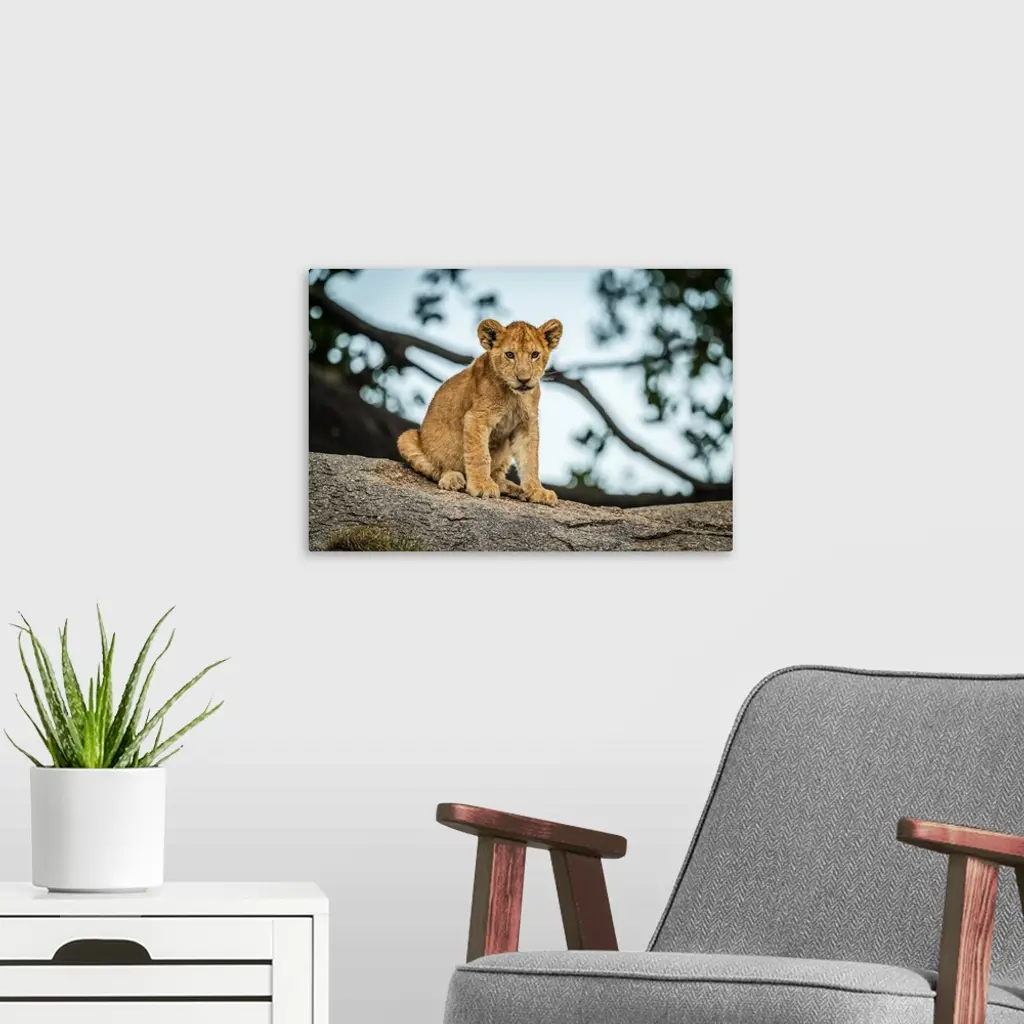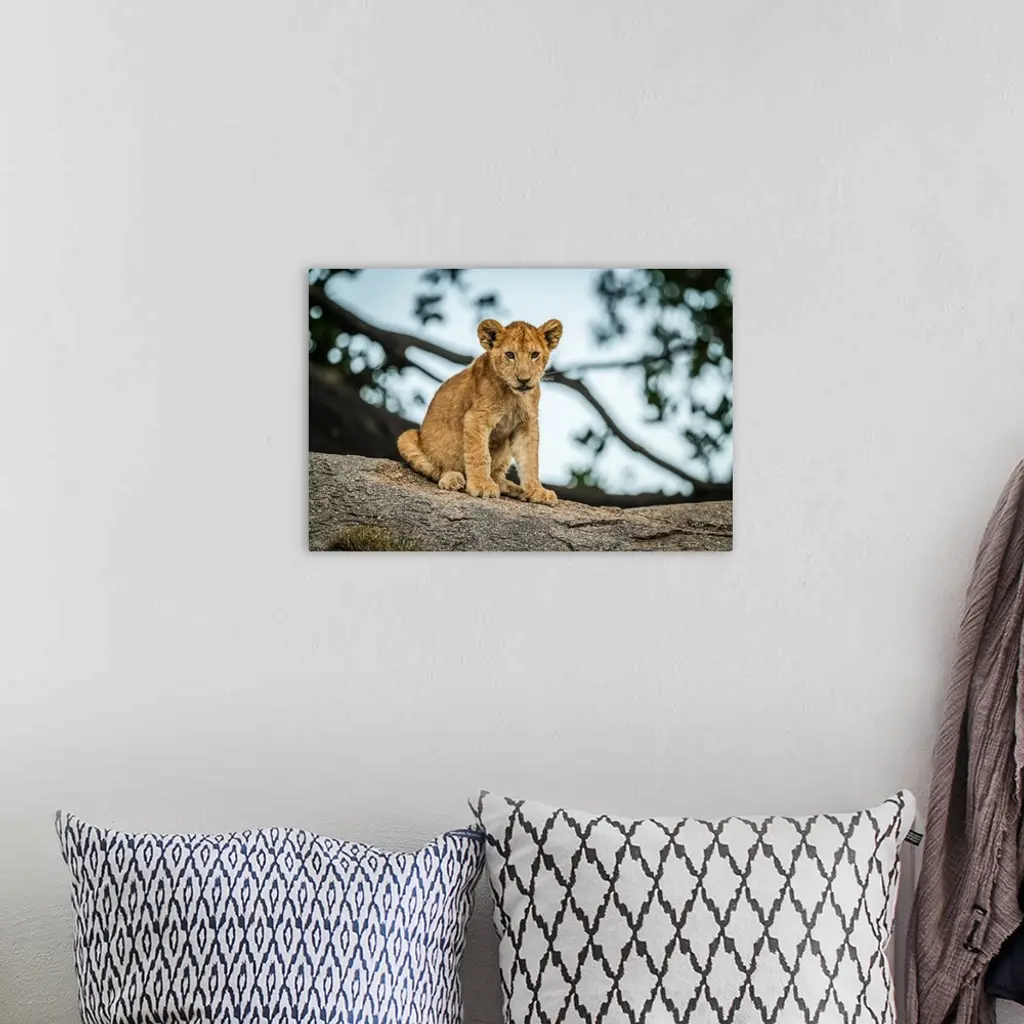 Lion Cub Sits On Rock By Tree, Serengeti, Tanzania