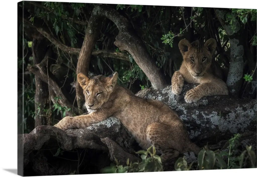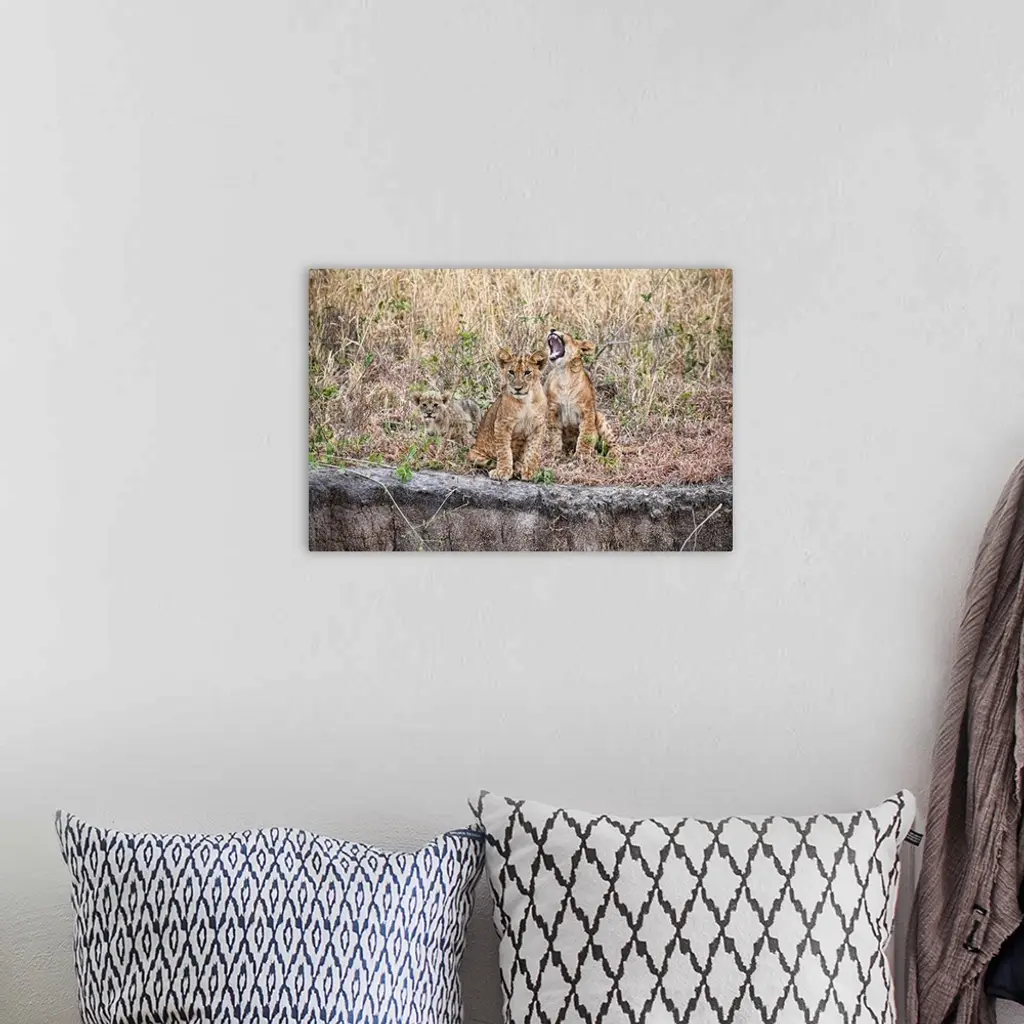 Several lion cubs, one yawning. Serengeti, Tanzania, Africa