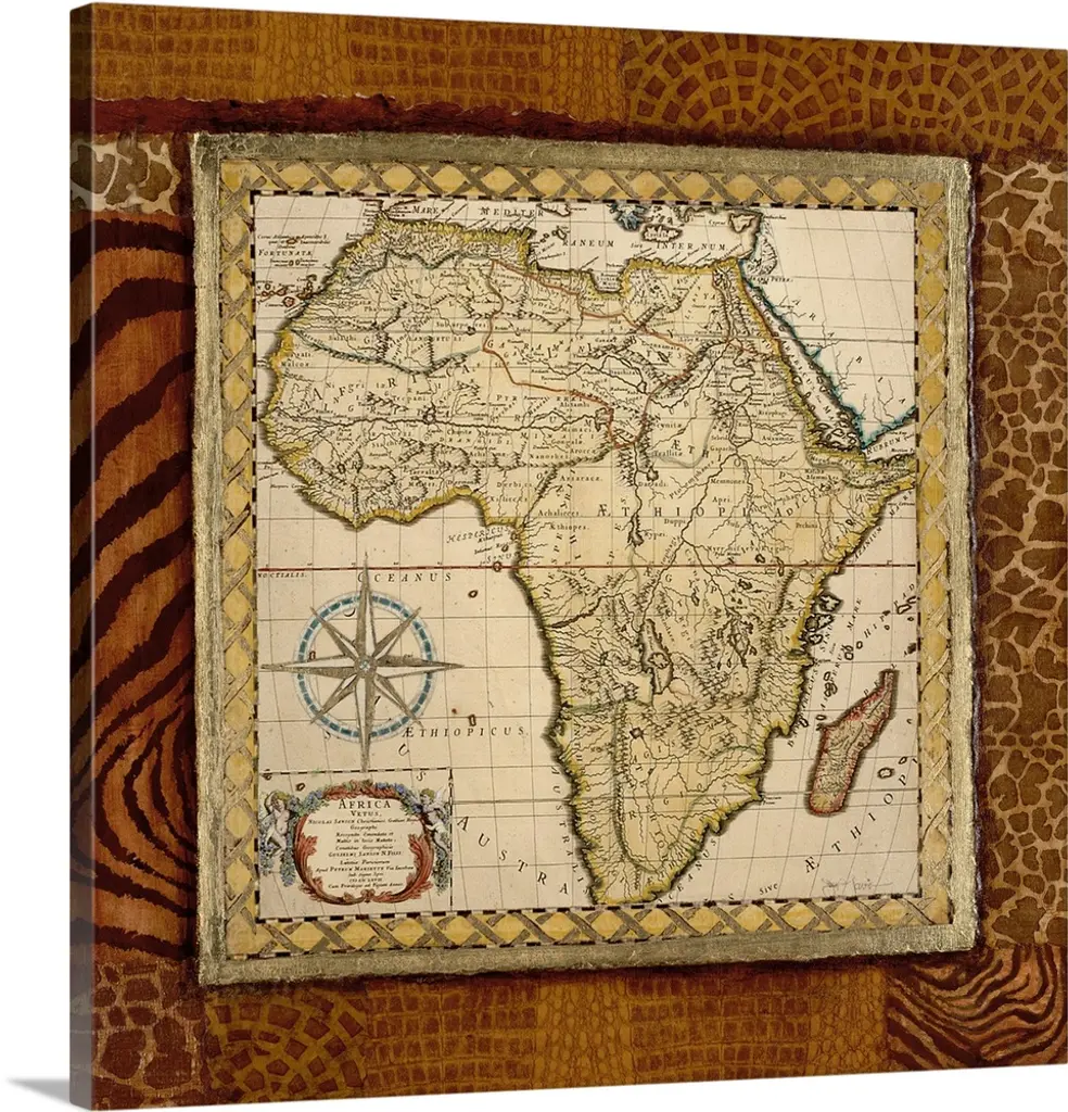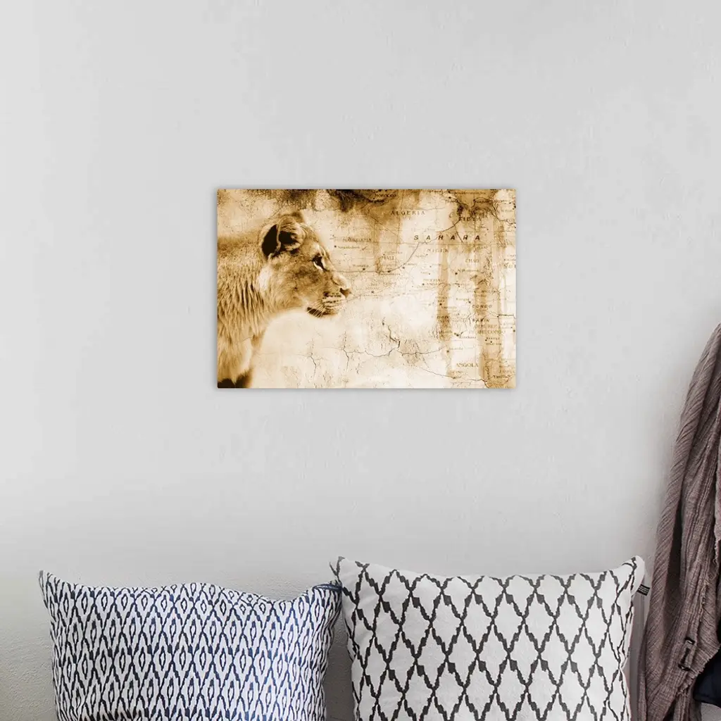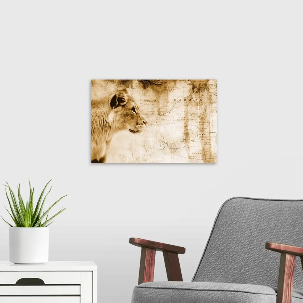 Lion In Front Of An Old Map Of Africa wall art for home and office decor. Discover canvas art prints, photos, mural, big canvas art and framed wall art in GreatBigCanvas.com's varied collections.