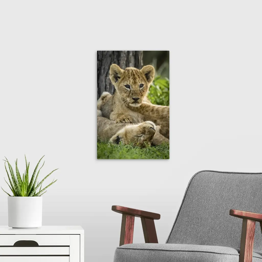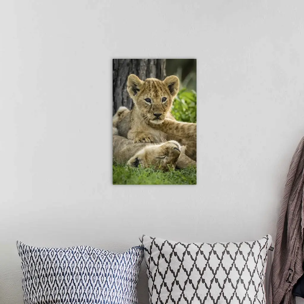 Lion (panthera leo) cubs lying in grass by tree, Serengeti national park, Tanzania.