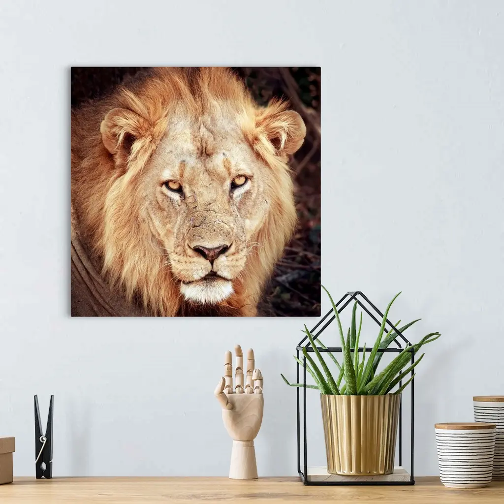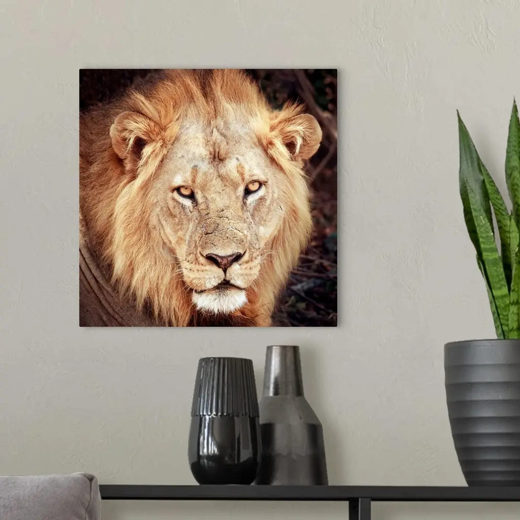 A square photograph of a lion.