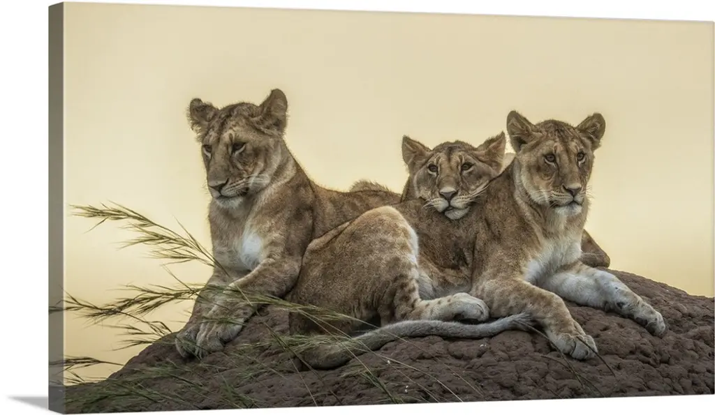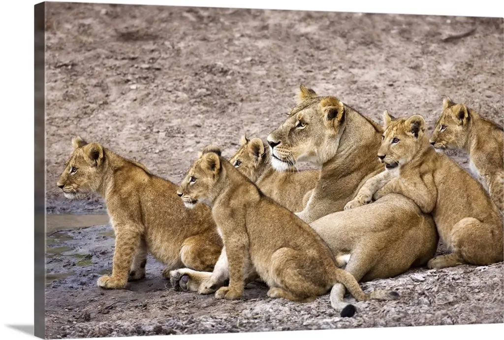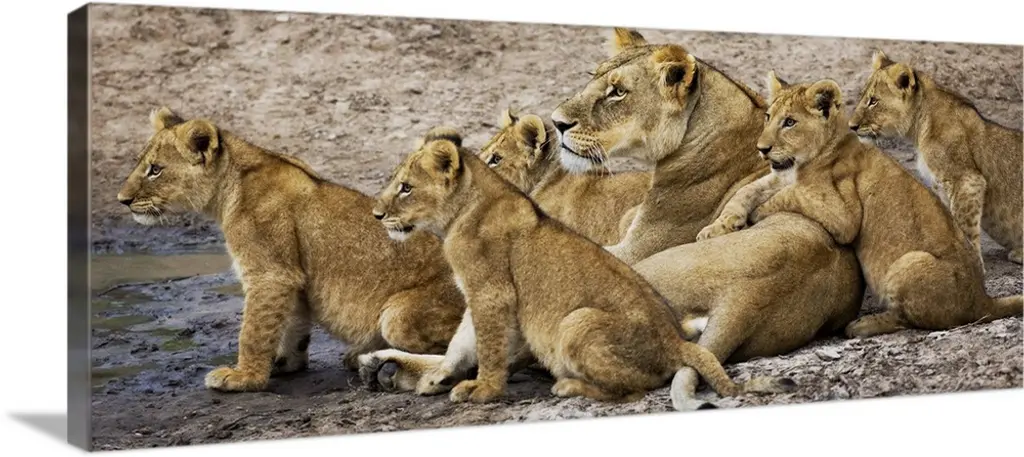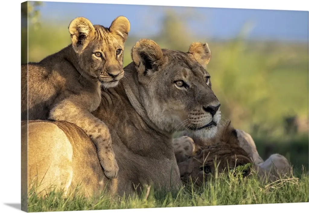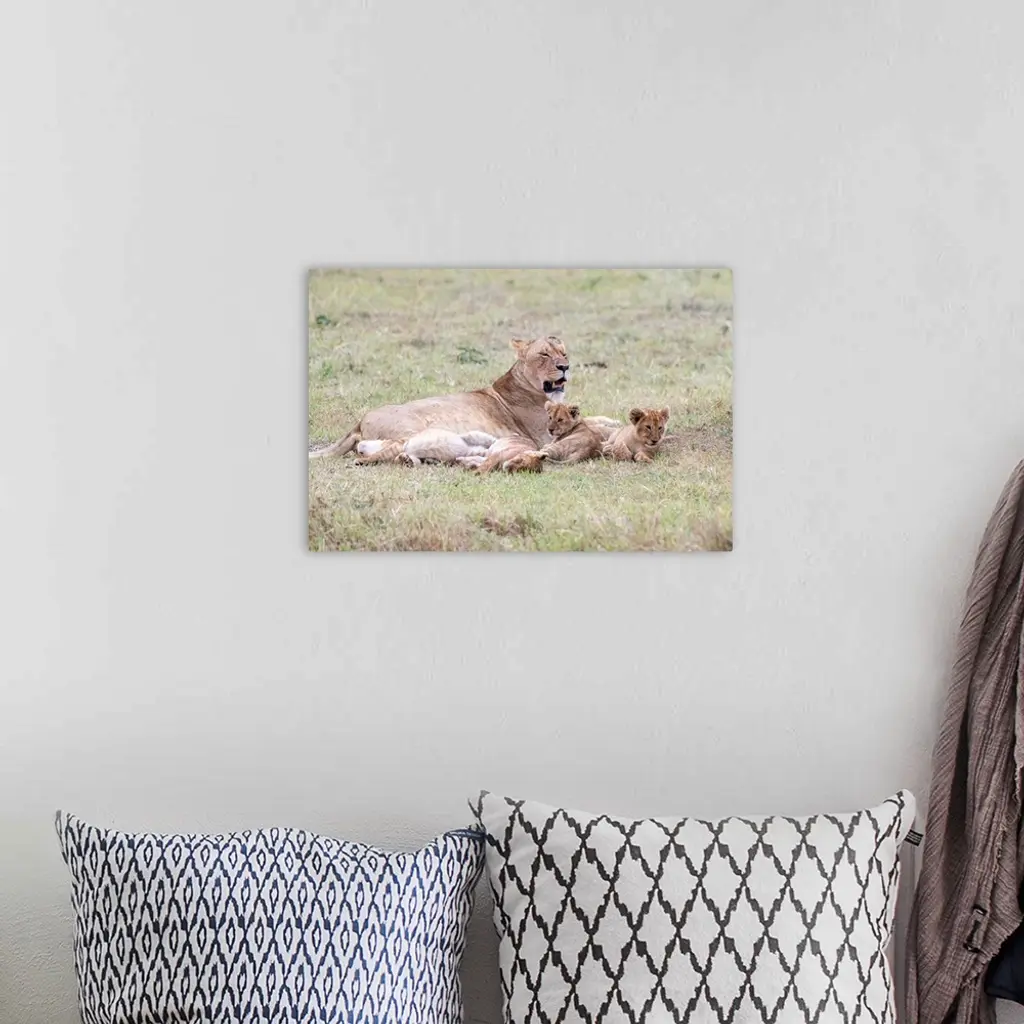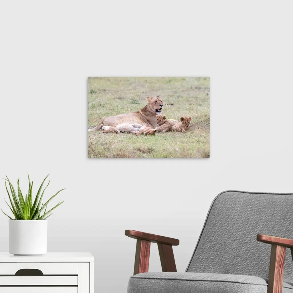 A female lion and her cubs in Maasai Mara National Park, Kenya, Africa.