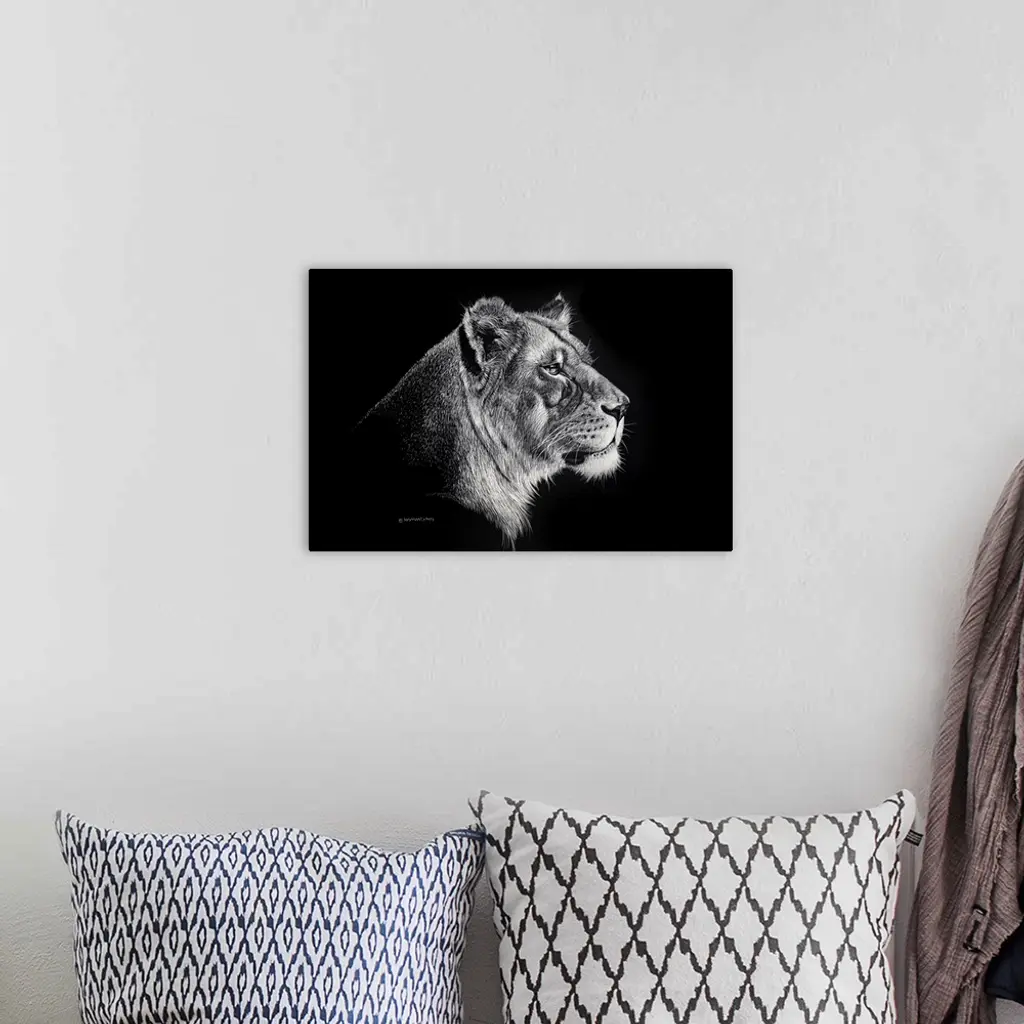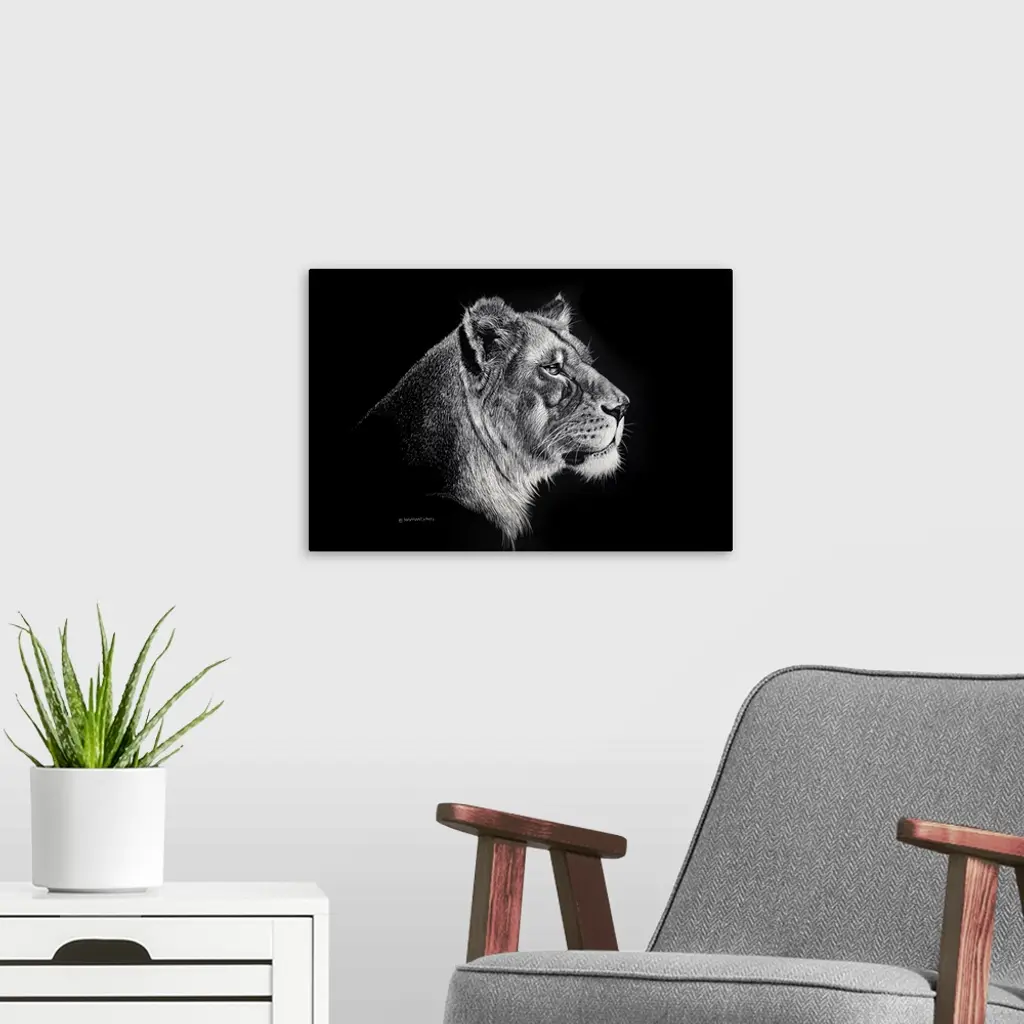 The power of this scratchboard is the beautiful eye of this Lioness. She is staring at her cubs and this piece shows the simple layers of hair that cover her powerful neck and head.