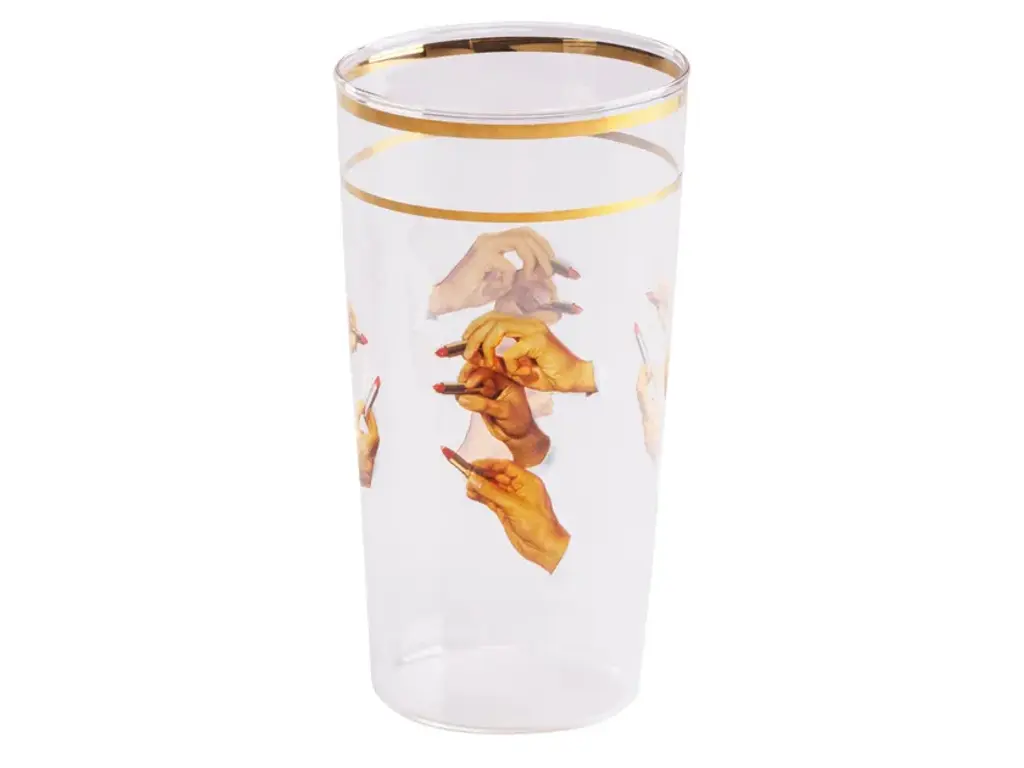 Set of six glasses made of glass with a golden edge. A slightly retro touch for a modern and edgy collection, in classic TOILETPAPER style. They’re perfect for aperitif sipped under a colorful neon light.Material: Borosilicate Glass, Gold