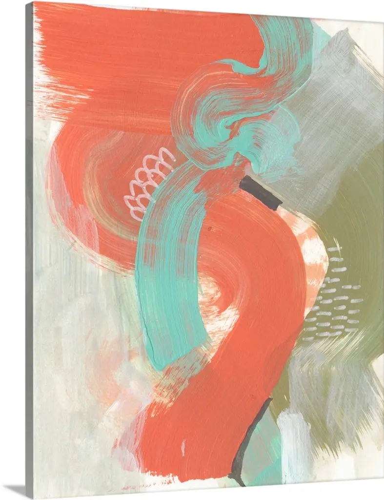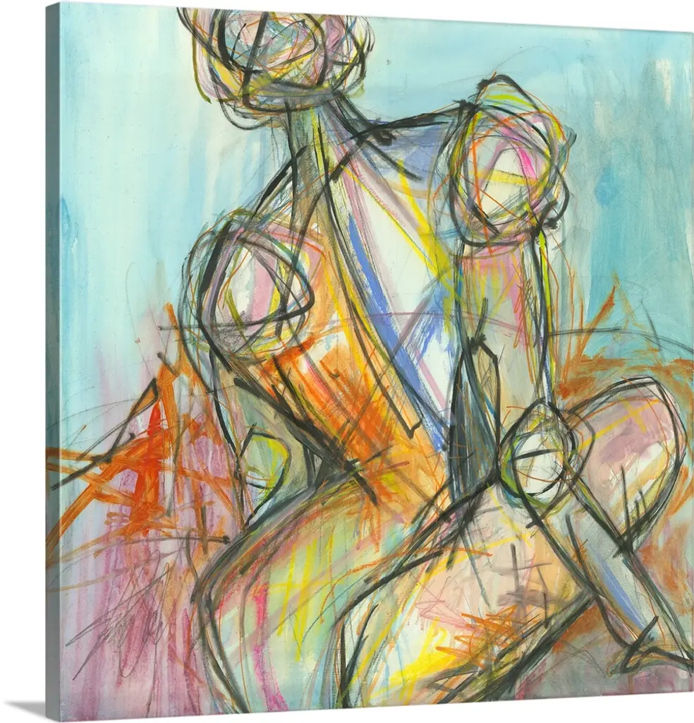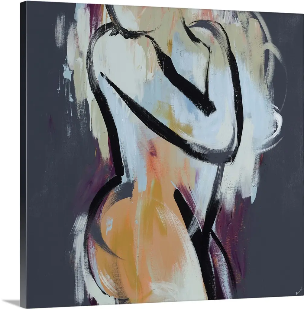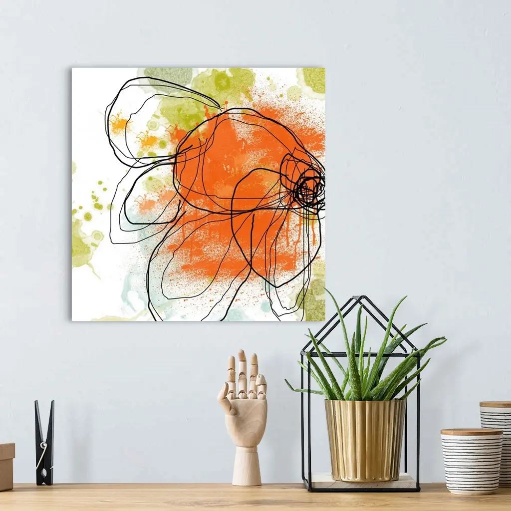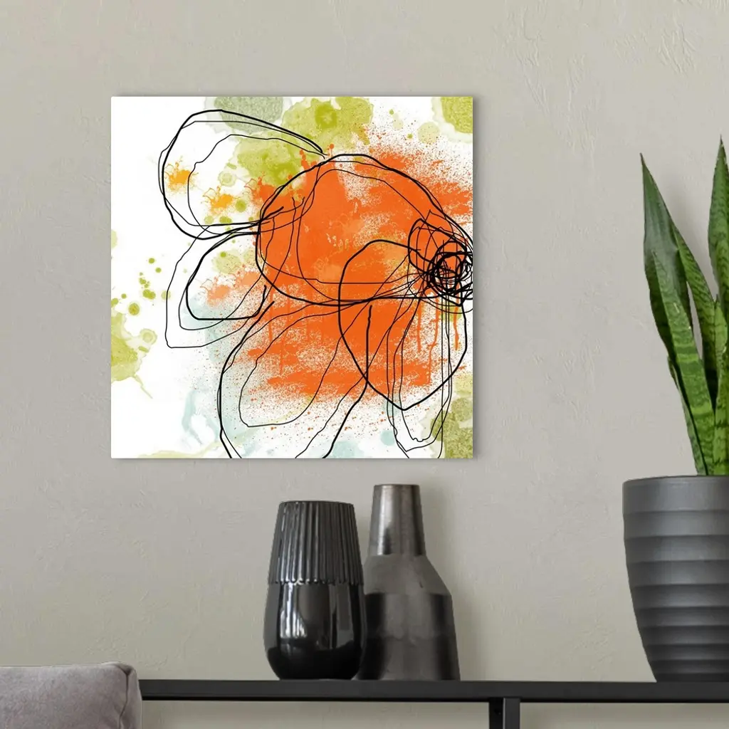 Large contemporary art shows an illustration of an outlined flower against a backdrop interspersed with splashes of a few bright colors.