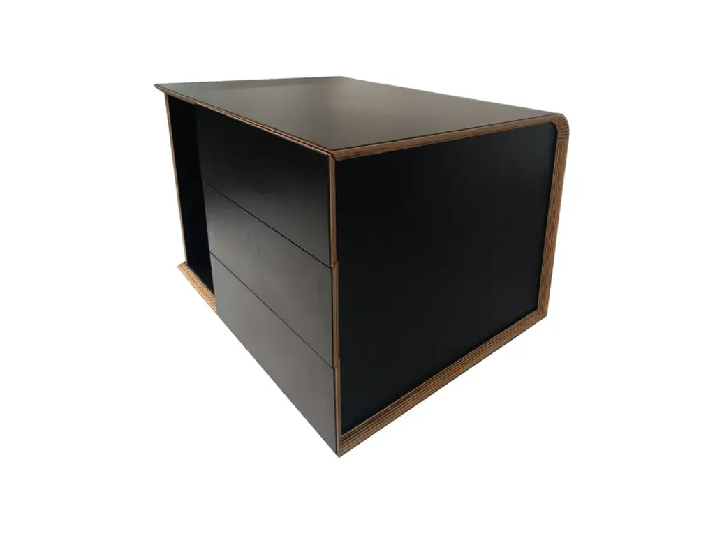 LIR cabinet with drawers is an element of LIR collection, characterised by clear minimalistic lines soften with curved edges which are achieved by incising notches in the material. These products are environmentally friendly and compatible with the requirements of sustainable development of the furniture industry. They are made from natural recyclable materials.Basically it's plywood panel coated with linoleum on both sides. Linoleum is made of natural and recycled components of linseed oil, wood flour and natural pigments.LIR collection is a series of eco friendly products made from linoleum. Linoleum is made of oxidized linseed oil, resins, wood and chalk powder and pigments. It meets environmental standards and is characterized by the many good qualities - it is bacteriostatic standards and is characterized by the many good qualities - it is bacteriostatic and antistatic, high temperature resistant and easy to maintain. Its surface is treated with water based coating that provides protection and facilitates maintenance.