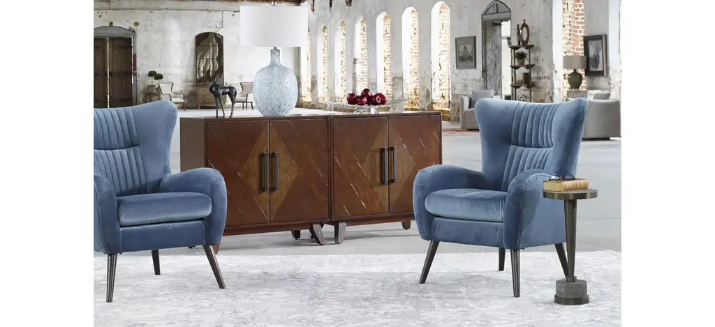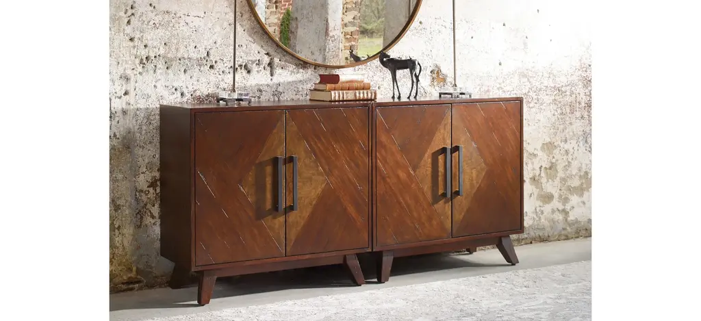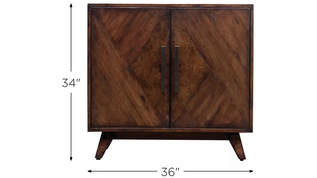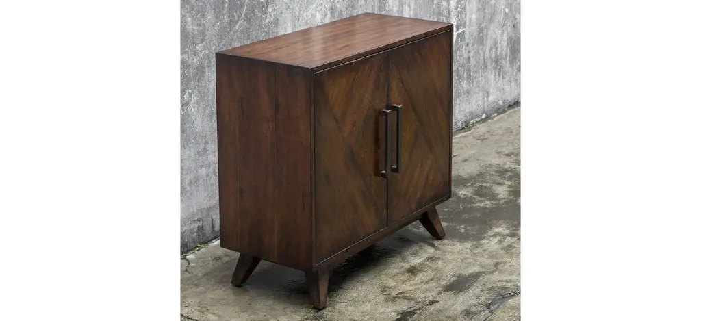 The Liri Accent Cabinet is a mid-century inspired styling, with geometrically pieced mango veneer doors accented with an ash burl veneer center finished in a deep mahogany stain. With natural distress marks and burnishing, complete with antique brass finished bar handles. It includes one adjustable interior shelf.